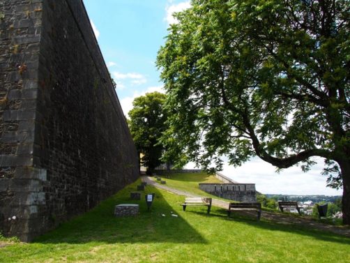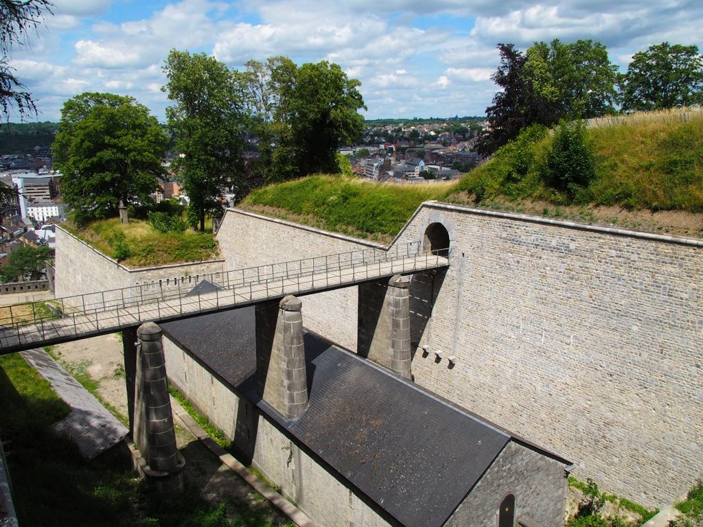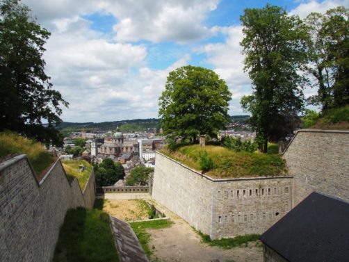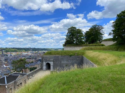 On se trouve ici à l’une des extrémités de la Citadelle, qui est si imposante qu’on peut franchement passer une journée rien qu’à explorer celle-ci ! De là, nous progressons le long de la Sambre en franchissant plusieurs portes et murailles. Les panoramas sur la vieille ville de Namur, juste en bas, s’apprécient encore plus quand on monte jusqu’ici à pied ! Nous bifurquons ensuite en direction du centre d’accueil Terra Nova (bien indiqué), situé dans une ancienne caserne.