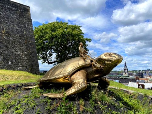 S’il y a de nombreux chemins permettant de monter jusqu’à la Citadelle (qui est d’ailleurs également accessible en voiture et – update – depuis peu à nouveau en télécabine !), les escaliers de trouvant juste en face du Parlement de Wallonie sont pour moi l’un des accès les plus agréables et faciles. Ceux-ci vous emmène directement à la statue de Jan Fabre qui a beaucoup fait parler d’elle, « Searching for Utopia« .
