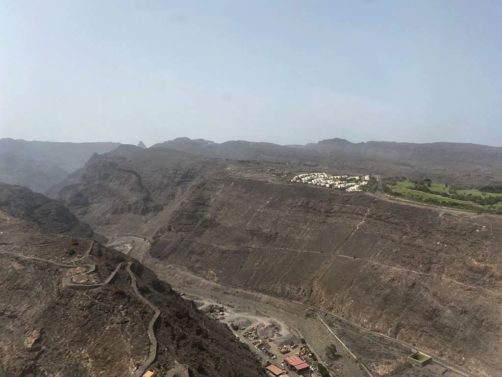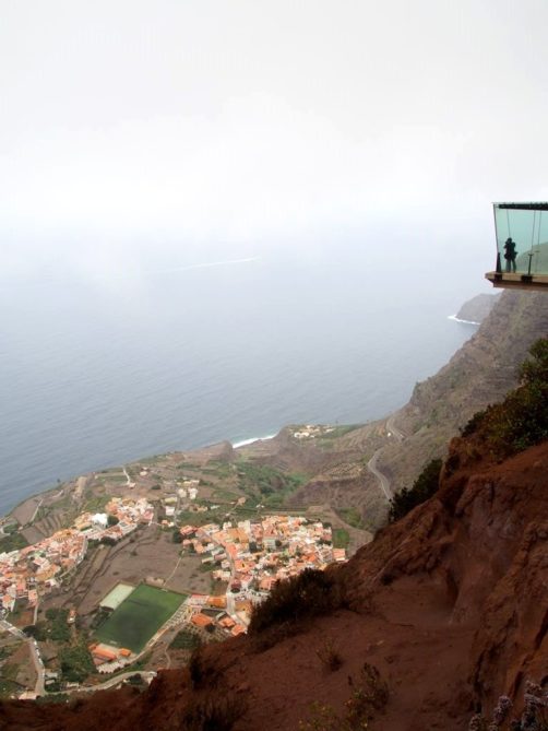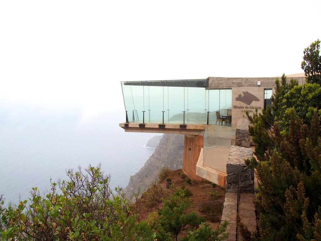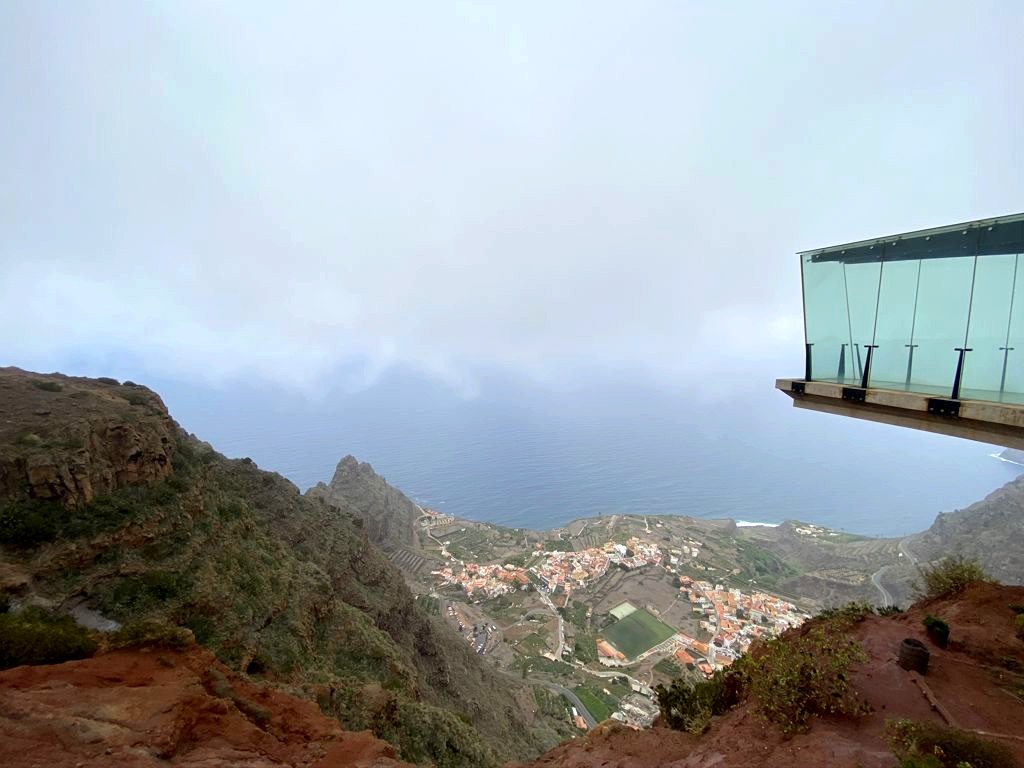 Depuis Agulo, nous pouvions apercevoir au sommet de la montagne le Mirador de Abrante, le plus connu de La Gomera à cause de son balcon en verre qui donne l’impression de marcher dans le vide. Quand la météo est dégagée (ce qui, à nouveau, n’est pas gagné d’avance dans le nord de l’île), on a une vue panoramique sur le nord de l’île et surtout sur Tenerife et le Teide au loin.
