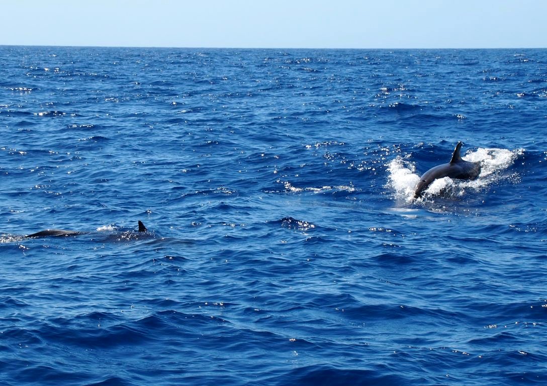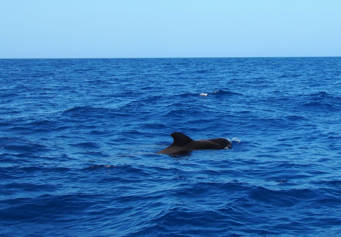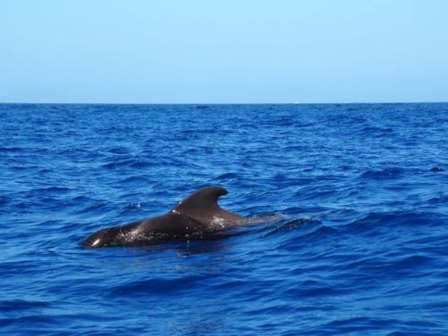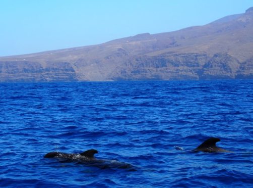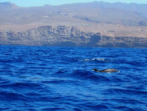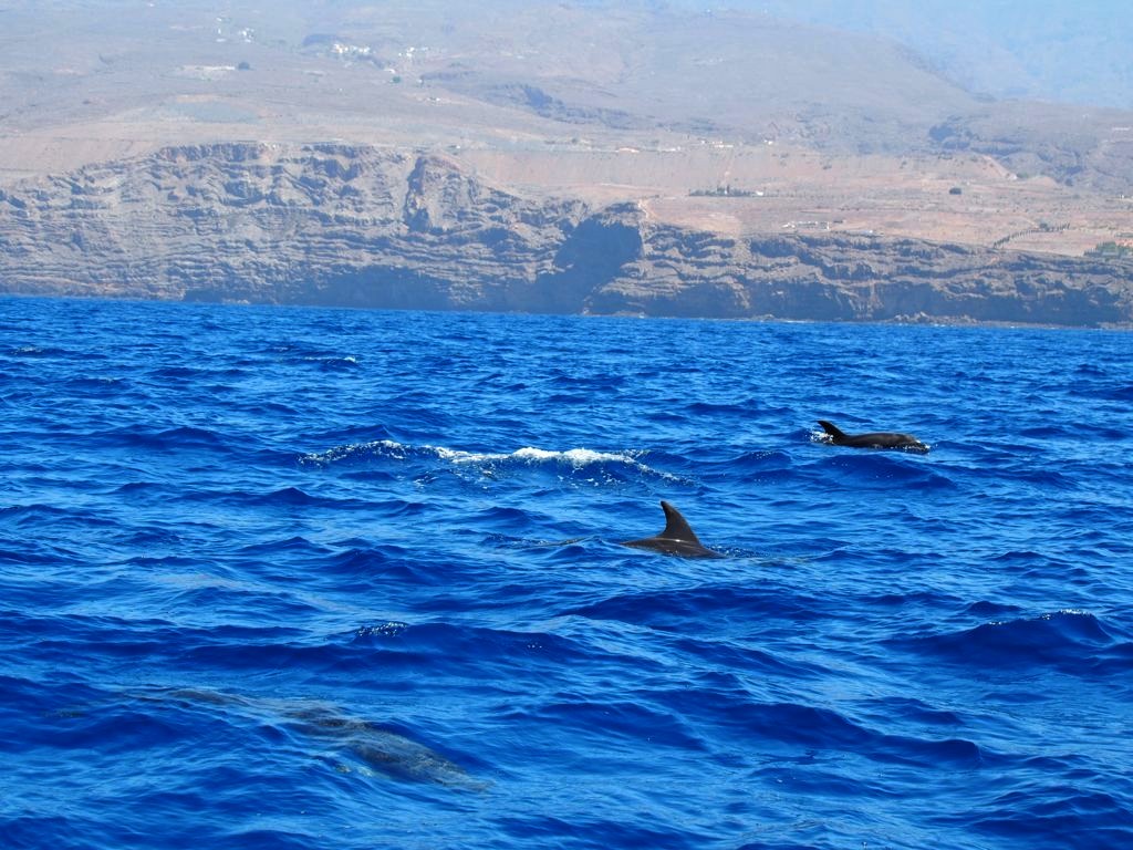 Nous sommes mêmes retombés un peu plus loin sur un deuxième groupe de pilot whales, avant de voir quelques grands dauphins (Bottlenose dolphin ou Tursiops), qui comme leur nom l’indique sont les plus grands dauphins au monde (ils peuvent atteindre jusqu’à 4 mètres de long). Nous aurons donc vu les deux espèces résidentes des côtes de La Gomera, que l’on peut observer toute l’année dans cette zone fixe.
