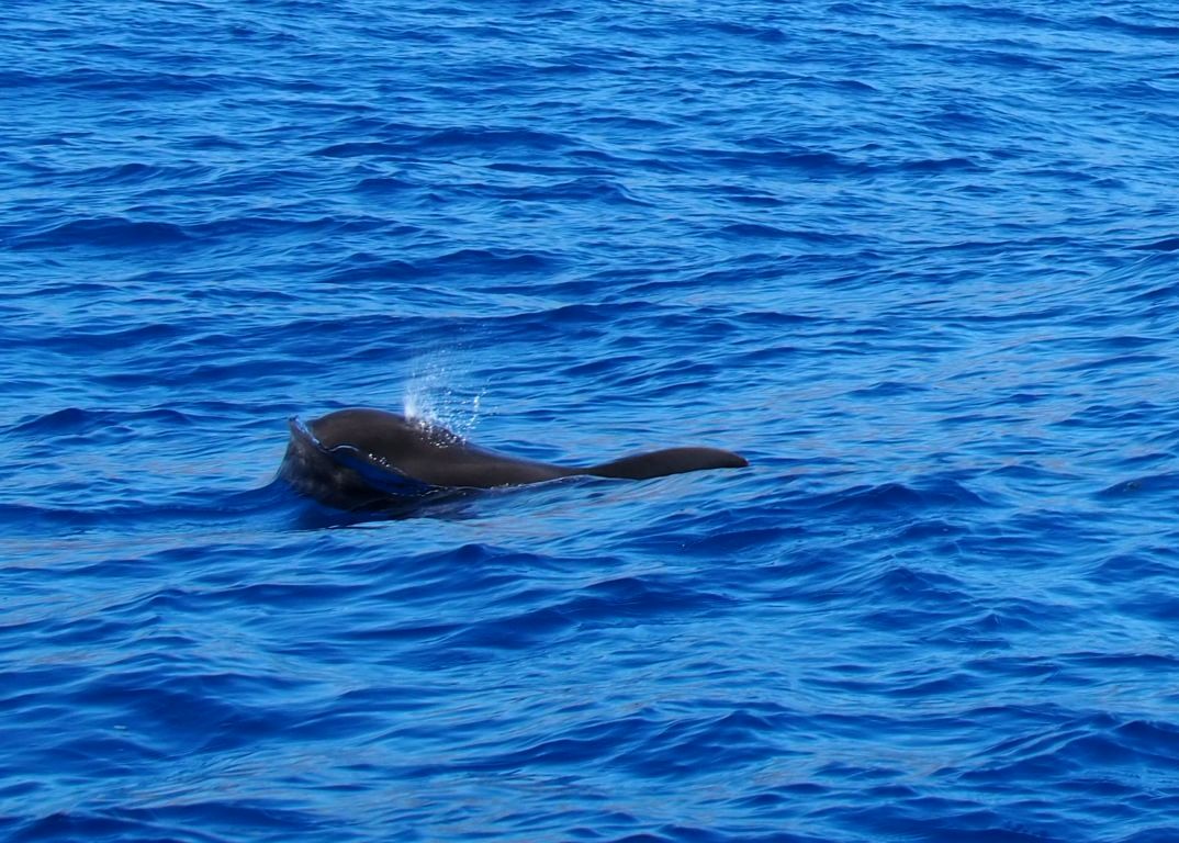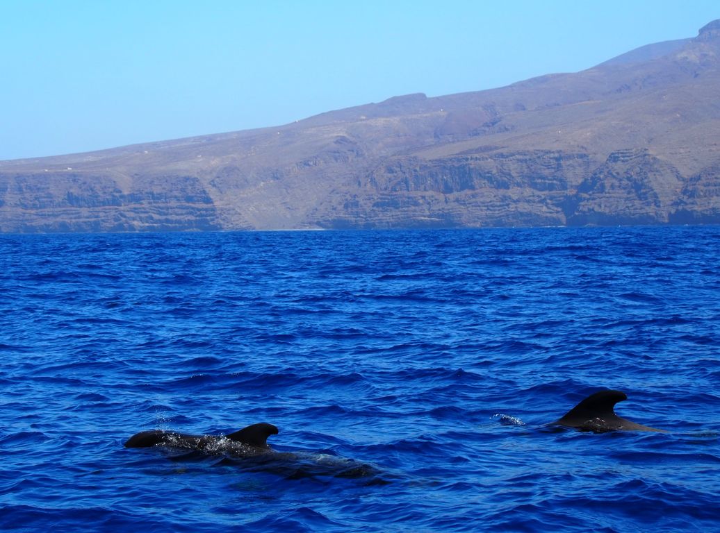 Covid oblige, nous n’étions que 9 personnes dans le bateau. Même si le masque était à cette époque obligatoire même sur le bateau, nous avons vraiment bien profité de l’excursion, d’autant plus que nous sommes tombés quasiment directement sur un premier groupe de baleines pilote / globicéphales (ils appartiennent en fait à la famille des delphinidés mais on les appelle baleines à cause de leur taille qui peut dépasser les 5 mètres de long). Il en existe une grande colonie entre La Gomera et Tenerife. On ne savait pas où donner de la tête : il y en avait partout !