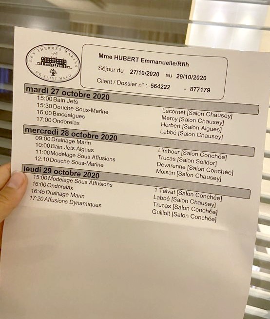 Durant ma cure de 3 jours, j’ai pu profiter de 4 soins par jour, qui avaient été regroupés à chaque fois en une demi-journée, soit le matin, soit l’après-midi. Entre chaque soin, et pendant l’autre demi-journée, j’avais donc tout le loisir de profiter du reste des installations thermales (dont je vous parle plus en détail juste après), ou d’aller explorer Saint-Malo, en fonction de mes envies.