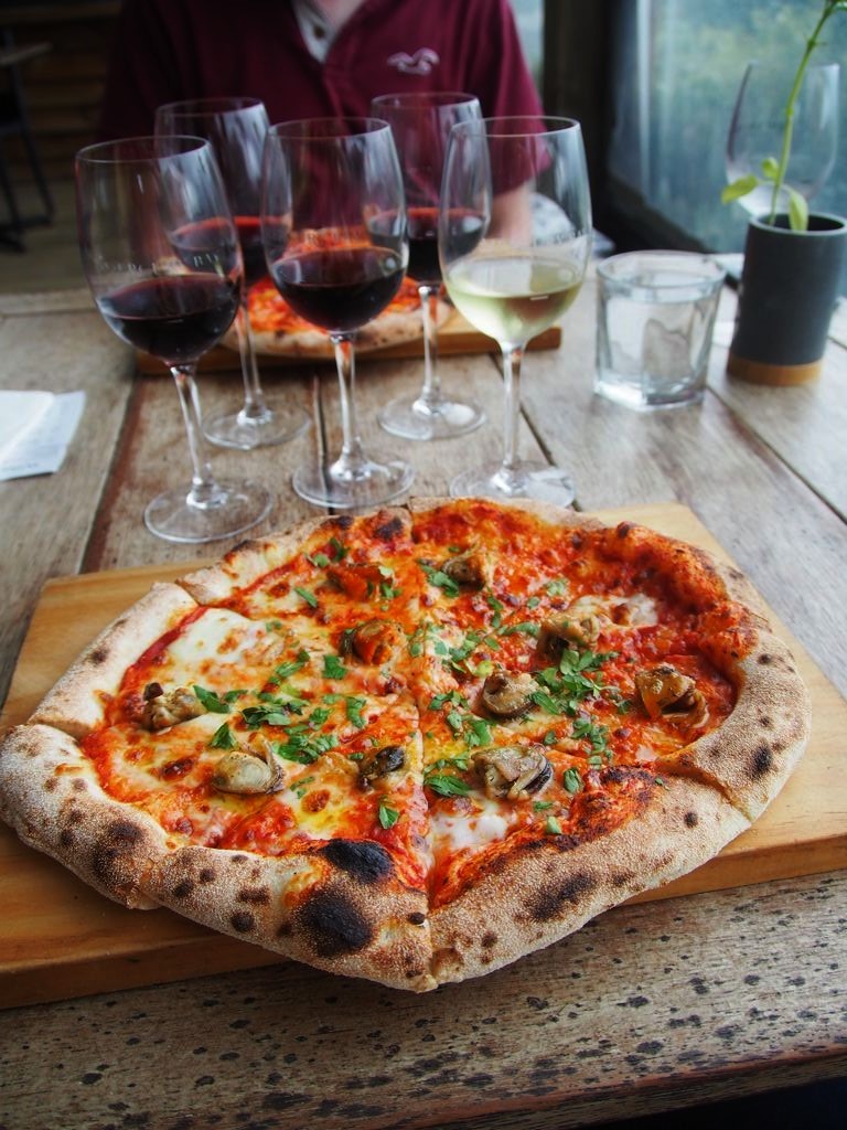 Au lieu d’aller à la Hot Water Beach, et vu que la météo n’était toujours pas trop avec nous, nous avons été nous réfugier ensuite dans un vignoble plutôt sympa pas loin de Cathedral Cove, le Mercury Bay Estate, où nous avons fait une chouette dégustation de vins accompagnée de très bonnes pizzas (dont une pizza aux fameuses moules de Coromandel, sympa !).