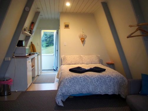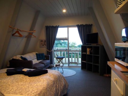 Comme je vous le disais plus haut, nous avons dormi deux nuits dans la Péninsule de Coromandel au Pohutukawa Coastal Chalets près de Coromandel Town. Nous avons logé dans un petit chalet pour deux personnes (mais il y en a de plus grands) hyper cosy, avec cuisine et un balcon avec vue sur la côte ! Nous avions également un bel espace extérieur rien que pour nous avec des transats et une table de picnic. Vraiment sympa !