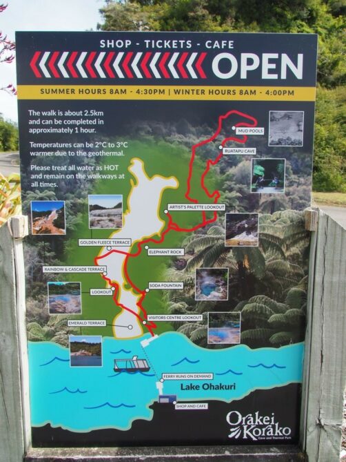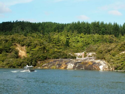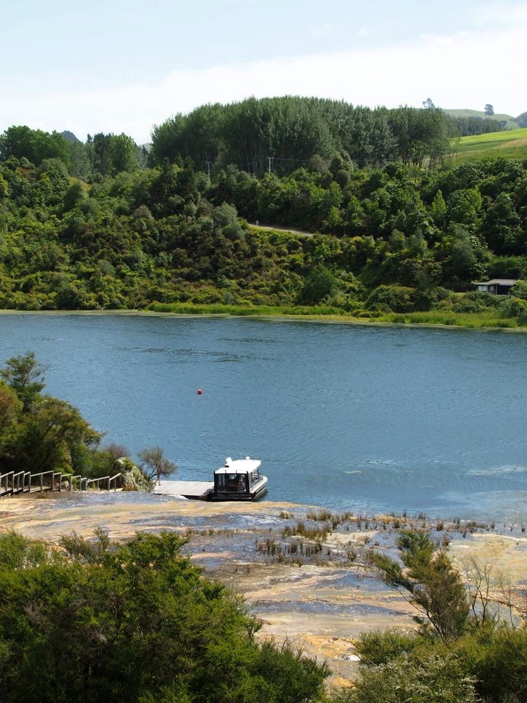 Notre premier arrêt dans la région de Taupo, en suivant la vallée géothermique depuis Rotorua, fut à Orakei Korako, un site géothermique assez unique, auquel on accède uniquement en bateau (le transfert en bateau est compris dans le prix de l’entrée).