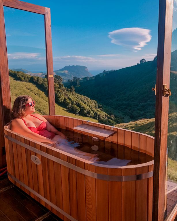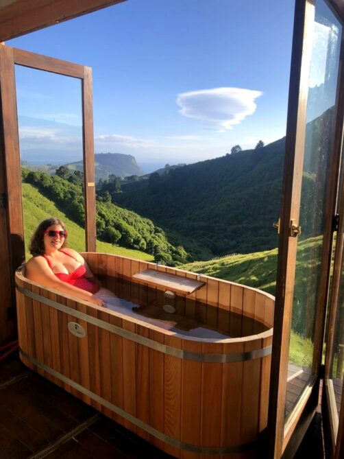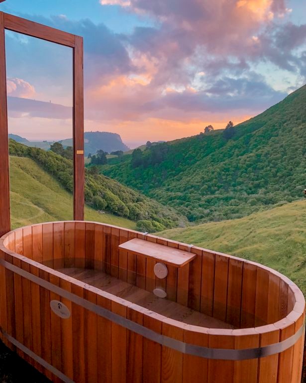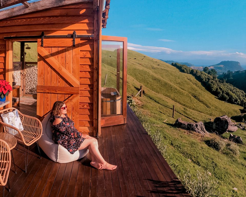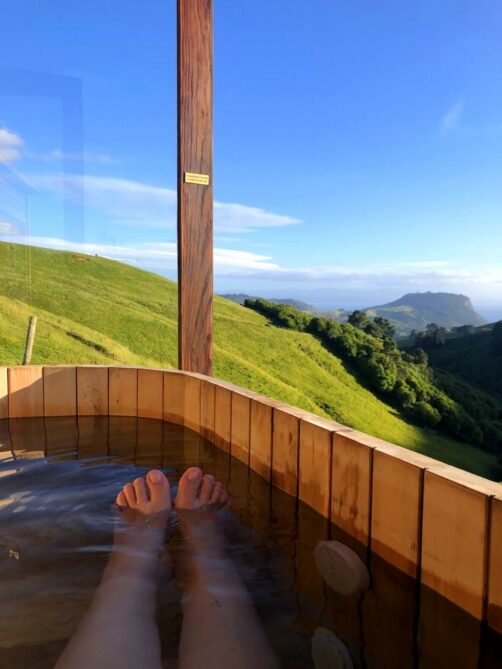 Nous avons passé deux nuits dans les hauteurs de Taupo à la Te Tuhi Hut, un des hébergements glamping haut de gamme que nous avions dénichés chez Canopy Camping et sans doute notre préféré du voyage ! La cabane perdue au milieu de nulle part offre une vue magnifique sur les montagnes et le lac Taupo au loin.