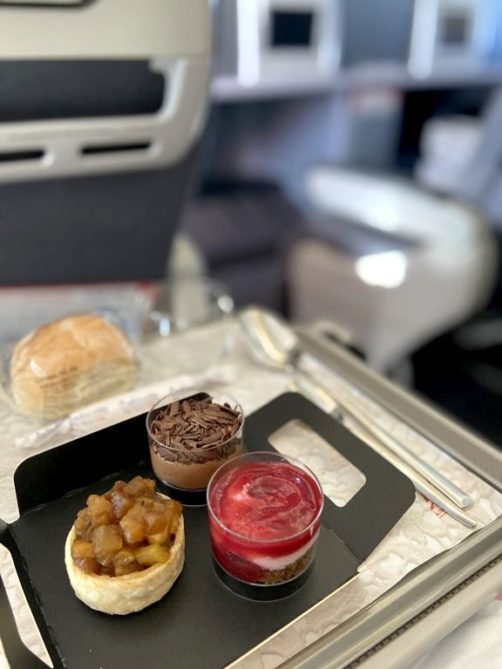 A l’aller, comme le vol aller était de jour, nous avons eu droit à deux repas complets. En Premium, le premier repas est servi en trois services (après un petit snack apéro et un verre de champagne).