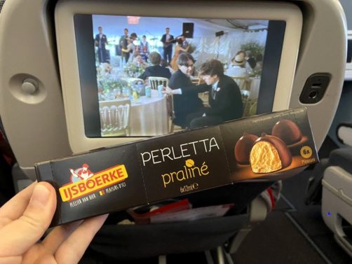 Vers le milieu du vol, nous avons eu la bonne surprise de nous voir proposer un quatre heure lui aussi bien belge, des Perletta au praliné de Ijsboerke (parfait en regardant un film !).