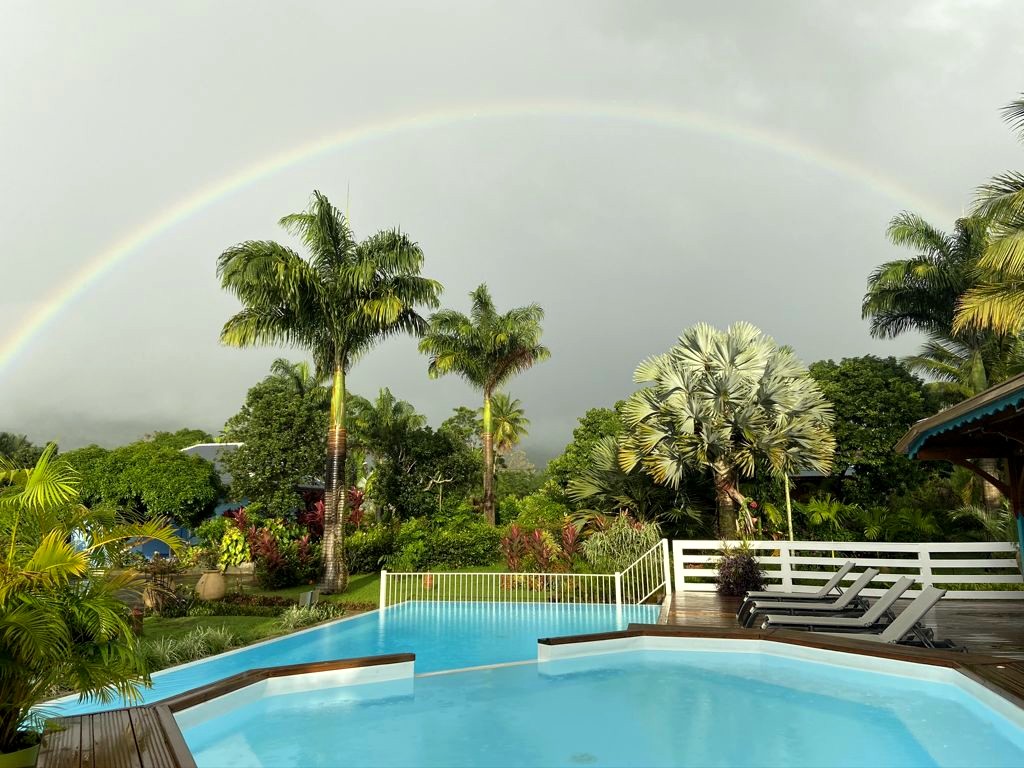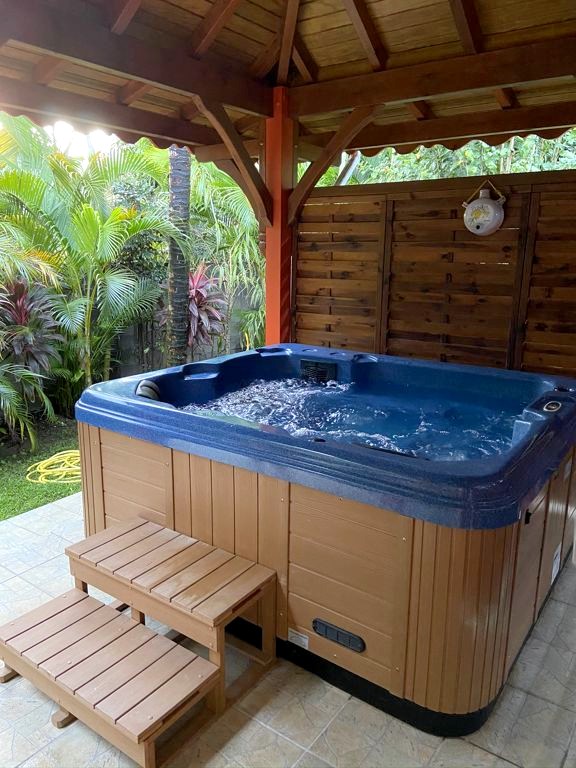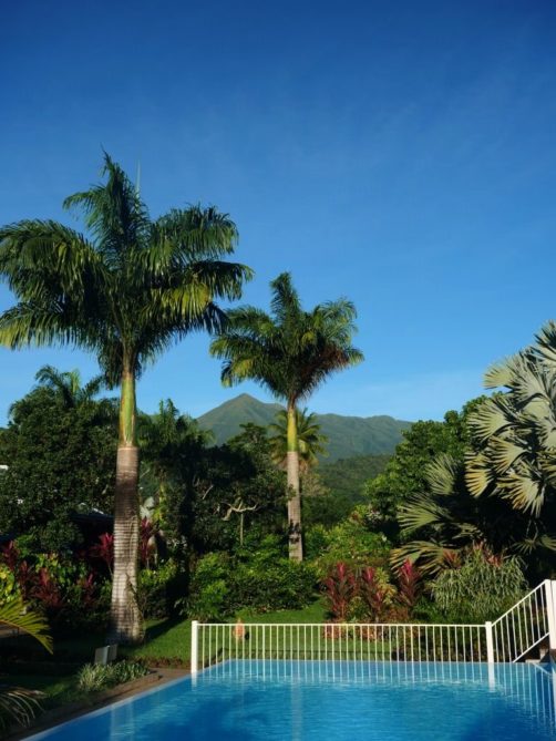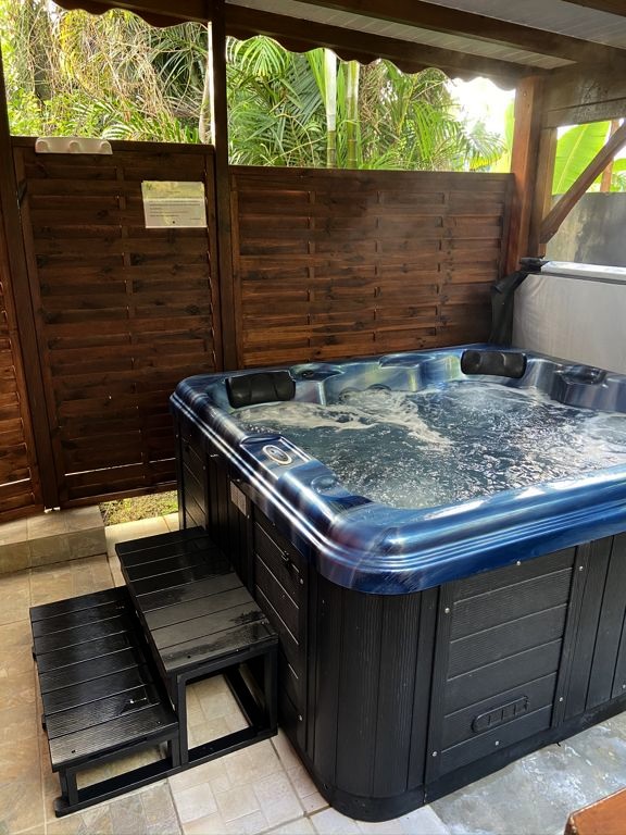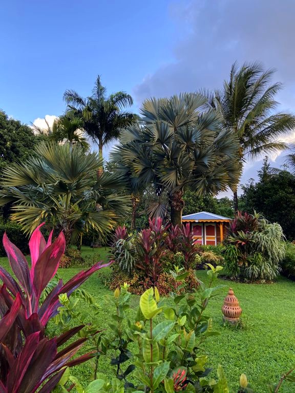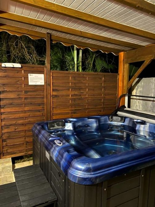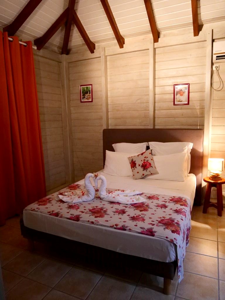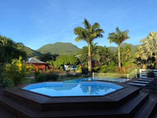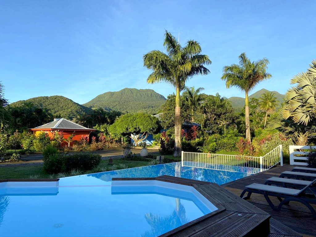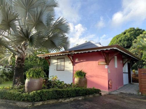 Nous avons séjourné sur l’île de Basse-Terre à l’Habitation Cantamerle à Capesterre, qui propose de beaux bungalows tout confort avec jacuzzi, entourés par un splendide jardin exotique. J’ai logé dans la Maison Cerise, un joli bungalow rose de 36 mètres carré, avec un coin salon, une grande cuisine équipée, une chambre climatisée, une salle de bain avec douche et une grande terrasse avec coin barbecue et grand jacuzzi extérieur. Quand le temps était bien dégagé, je pouvais même voir un petit bout de la Soufrière depuis le jacuzzi !