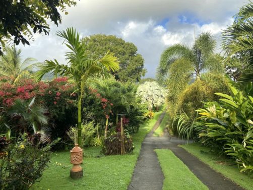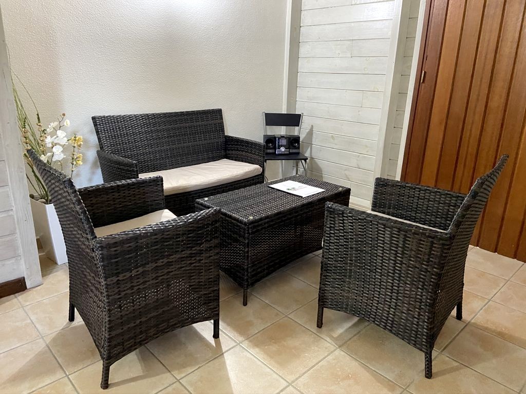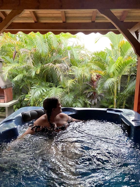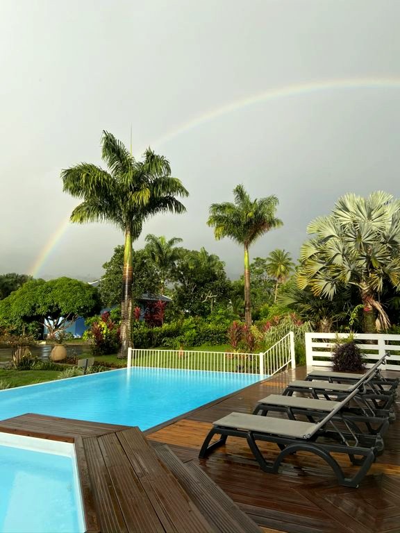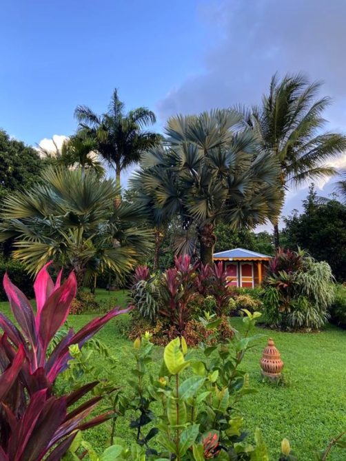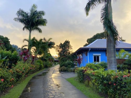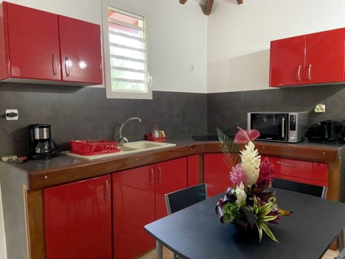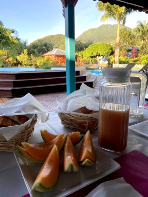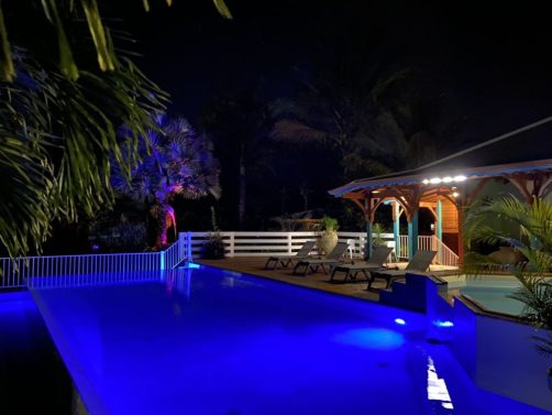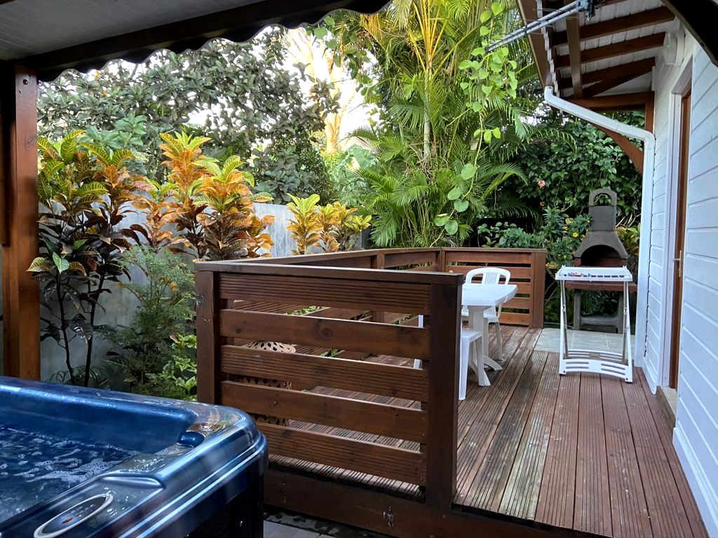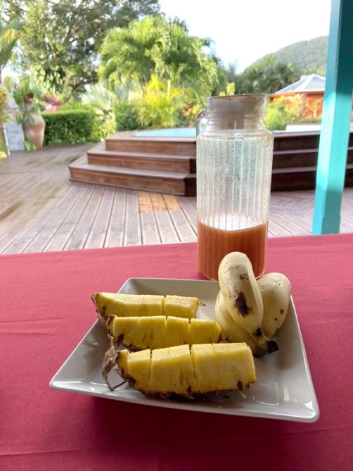 Nous avons séjourné sur l’île de Basse-Terre à l’Habitation Cantamerle à Capesterre, qui propose de beaux bungalows tout confort avec jacuzzi, entourés par un splendide jardin exotique. J’ai logé dans la Maison Cerise, un joli bungalow rose de 36 mètres carré, avec un coin salon, une grande cuisine équipée, une chambre climatisée, une salle de bain avec douche et une grande terrasse avec coin barbecue et grand jacuzzi extérieur. Quand le temps était bien dégagé, je pouvais même voir un petit bout de la Soufrière depuis le jacuzzi !