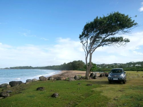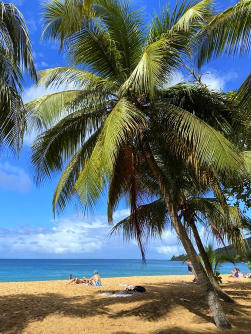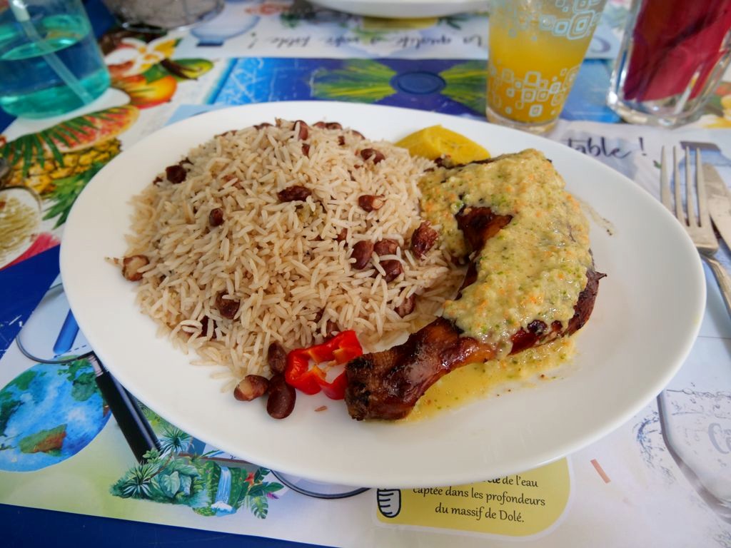 La plage de Grande Anse à Deshaies est une grande plage de sable doré d’1km de long, bordée de palmiers et de quelques petits restaurants, ce qui en fait un très bon arrêt pour un lunch local les pieds dans le sable. Nous avons mangé un délicieux poulet boucané au restaurant Les Hibiscus, que je vous recommande.