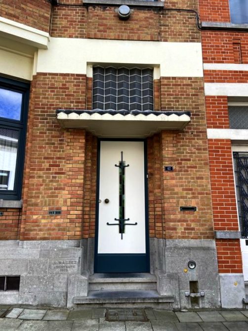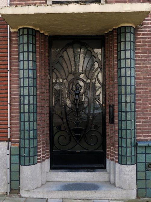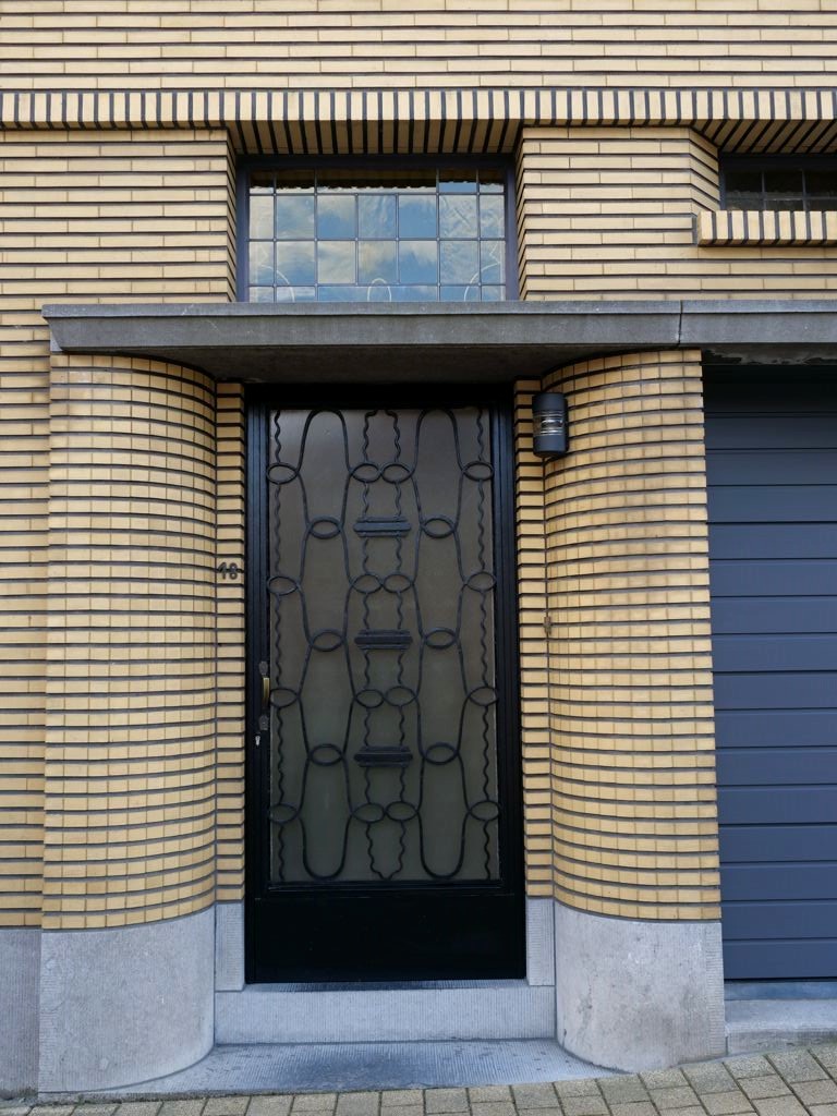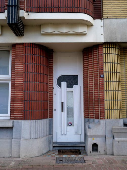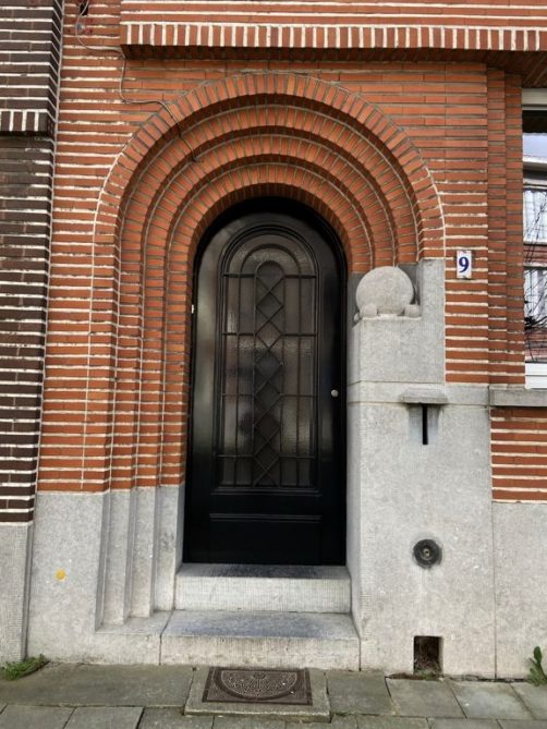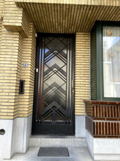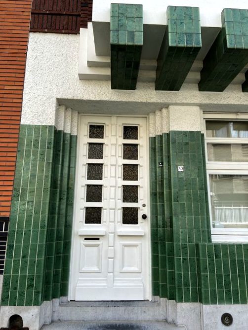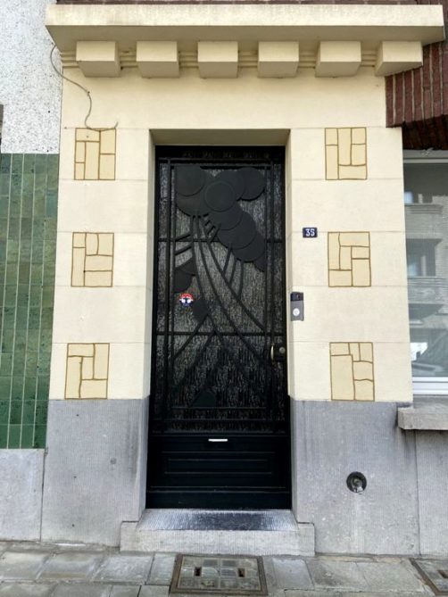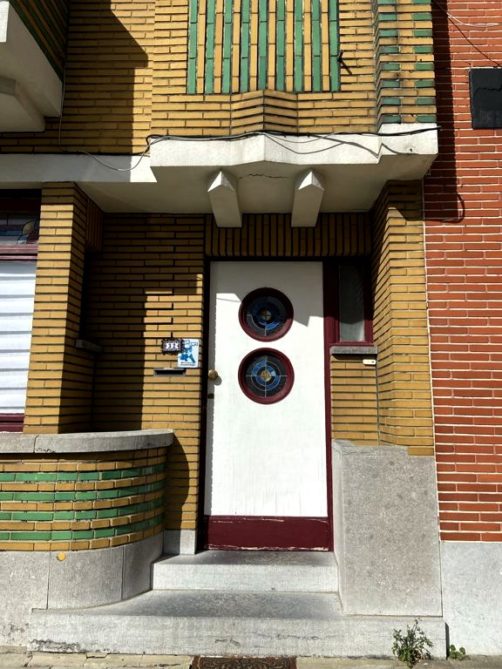 Nous tournons ensuite à droite vers la rue Léopold Sturbaut, qui est véritablement LA rue Art Déco immanquable à Renaix ! Ce lotissement a été réalisé entièrement dans les années 30, ce qui donne un ensemble remarquable. L’aller-retour dans la rue permet d’admirer un côté à la fois. En ce qui me concerne, j’avais envie de prendre en photos toutes les portes !