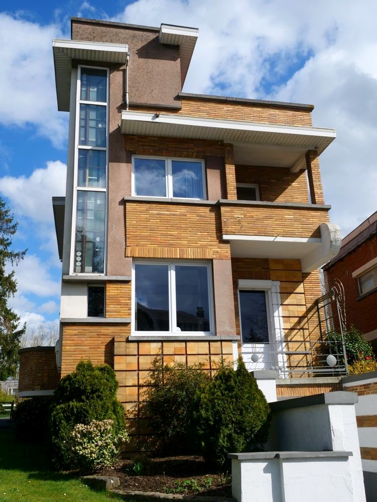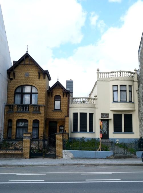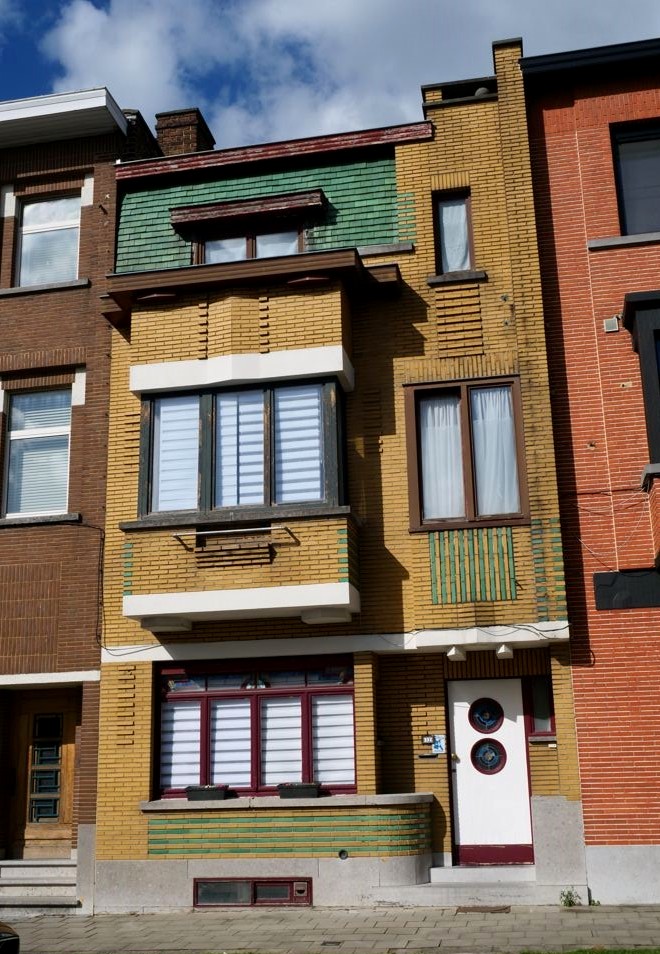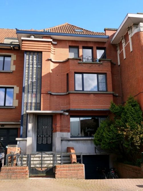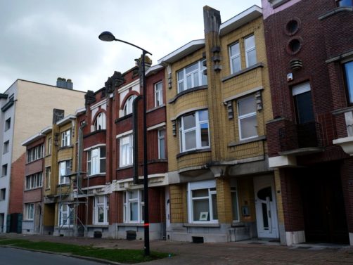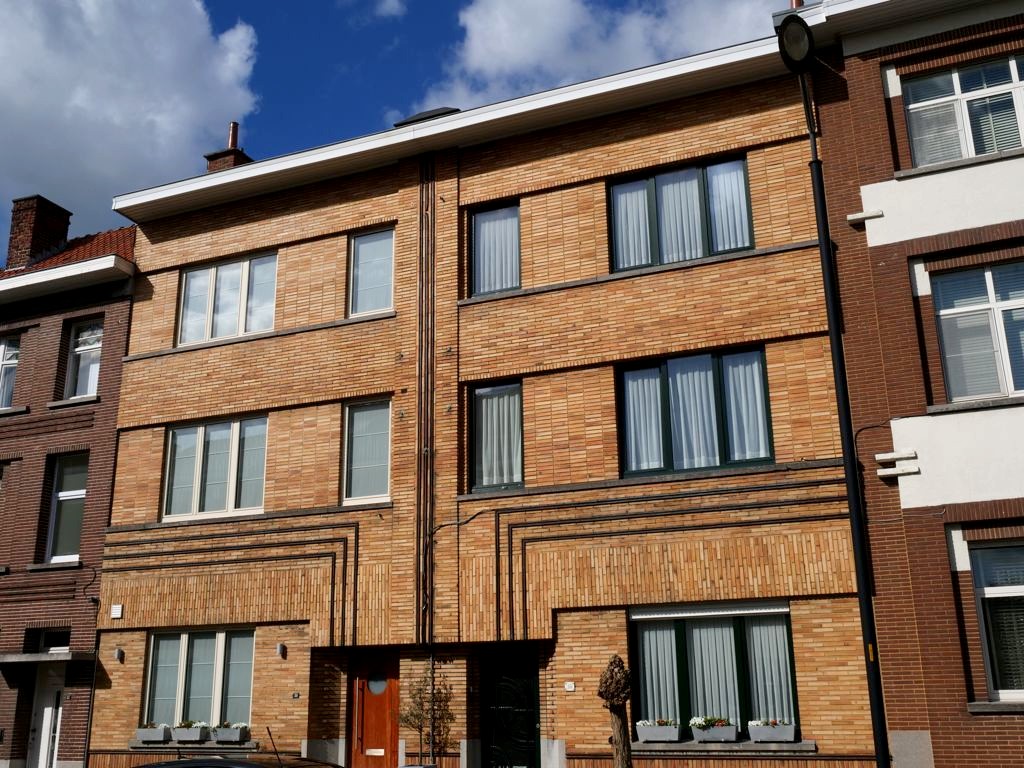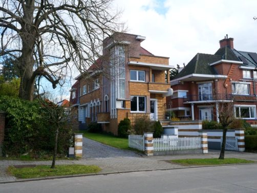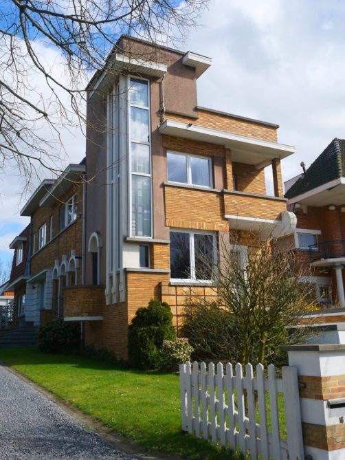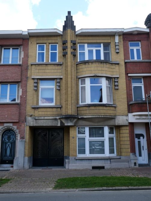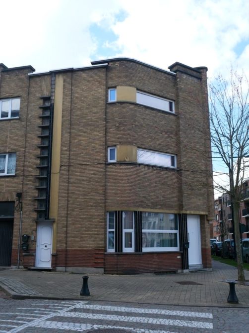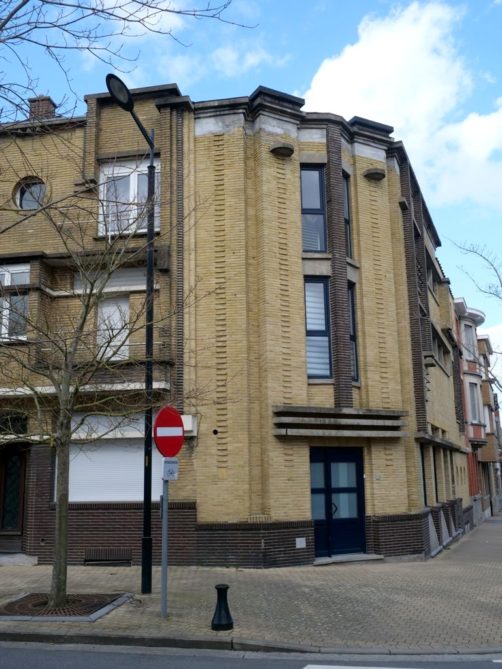 Nous retournons sur nos pas et retraversons le pont pour descendre à présent le boulevard du Quatre-Mars, où se trouve également quelques maisons Art Déco, jusqu’à l’avenue Gomar Vandewiele, sur la droite, où se trouve une rangée de maisons Art Déco plus parlante, réalisées en miroir et en briques jaunes et oranges, un classique de l’Art Déco belge !