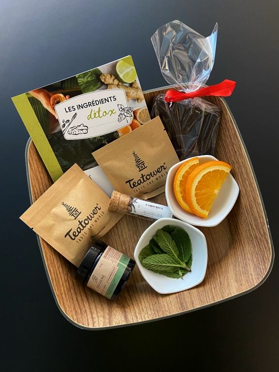 - un panier bien-être incluant des produits cosmétiques belges, une tisane détox et du chocolat