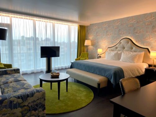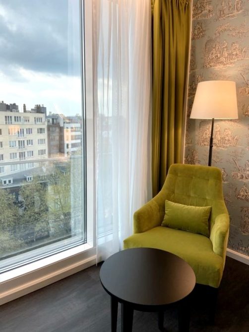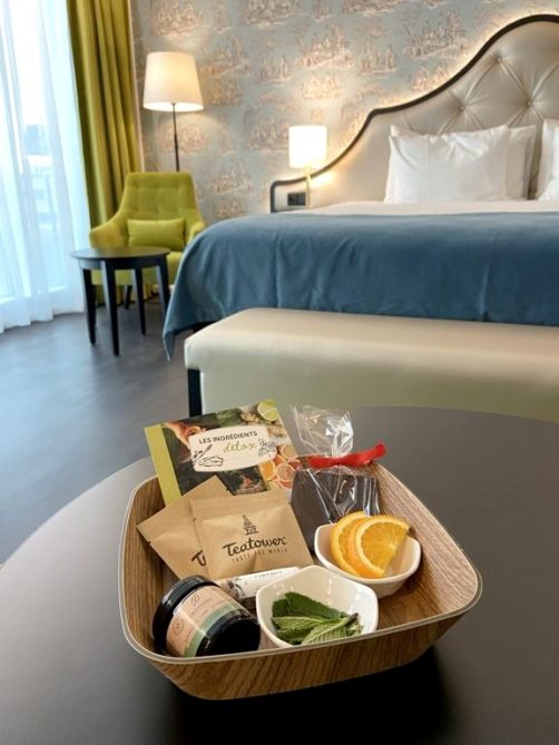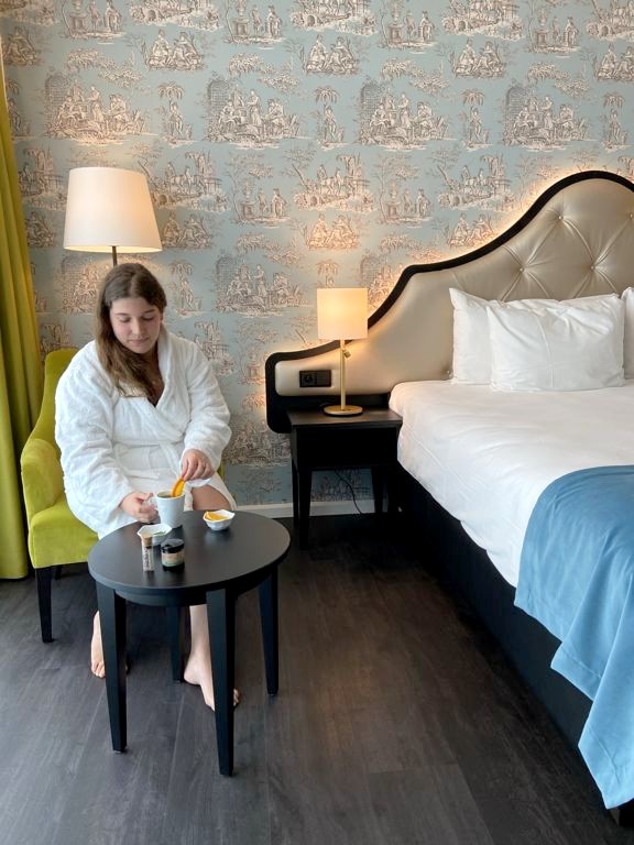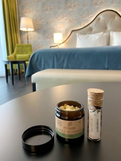 La chambre est ultra confortable (mention spéciale pour le matelas et les oreillers ultra fluffy !) et convient aussi bien à un séjour en amoureux qu’entre copines, surtout avec le super panier wellness compris dans la formule, en collaboration avec le shop « GreenMeow » pour les cosmétiques belges et « TeaTower » pour les tisanes détox. On retrouve la marque Indigène pour le gommage du corps à la menthe et citron vert, et La Rocca pour les sels de bain floraux, made in Ixelles, à l’odeur incroyable. Une belle manière pour l’hôtel de soutenir et faire découvrir par la même occasion de chouettes artisans belges.