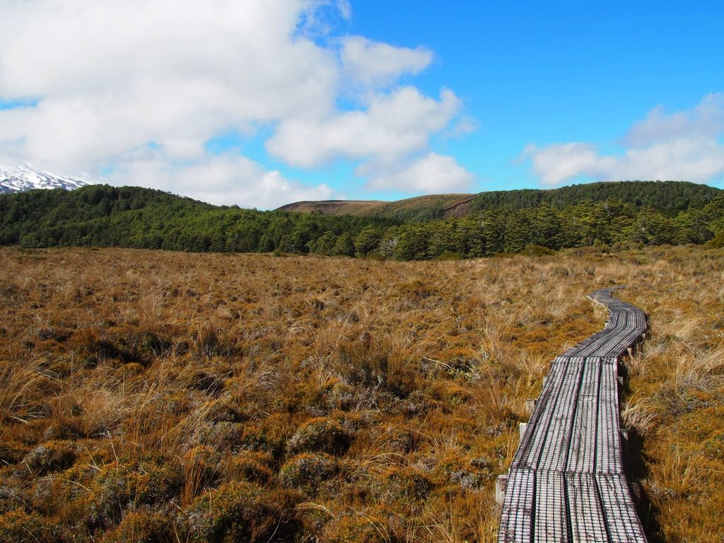 - Silica Rapids Walk : nous avons fait la première partie de cette randonnée facile de 7km qui longe une rivière avec quelques rapides. Il y avait même un petit air des Fagnes avec les pontons en bois et la végétation, les volcans en plus en arrière plan !