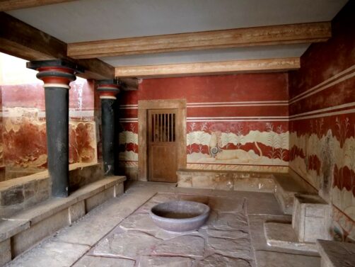 Les minoens sont souvent associés au mythe de l’Atlantide, et Knossos est considérée par certains comme la plus vieille ville d’Europe. Le Palais de Knossos, qui se trouvait au cœur de la ville, était le centre politique et cérémoniel de cette civilisation particulièrement précoce. Il était si grand (20 000 m²) qu’on pense qu’il a inspiré le mythe du labyrinthe du Minotaure (d’où le nom qui fut donné à cette ancienne civilisation).
