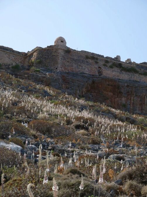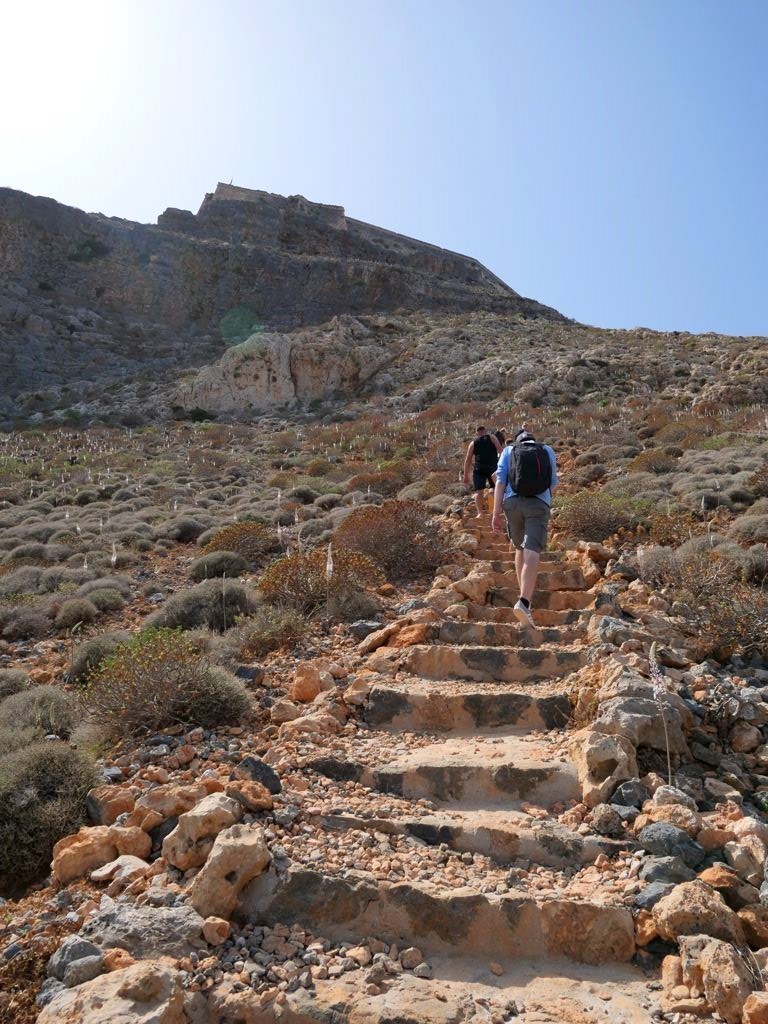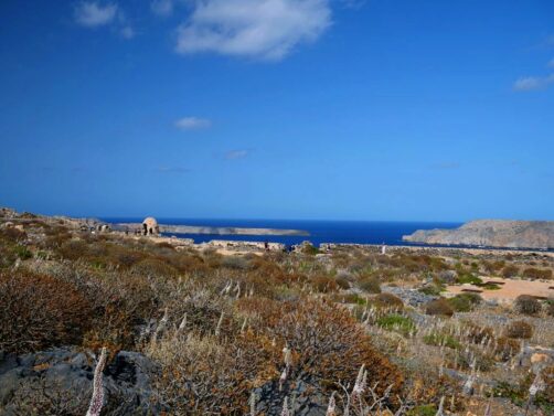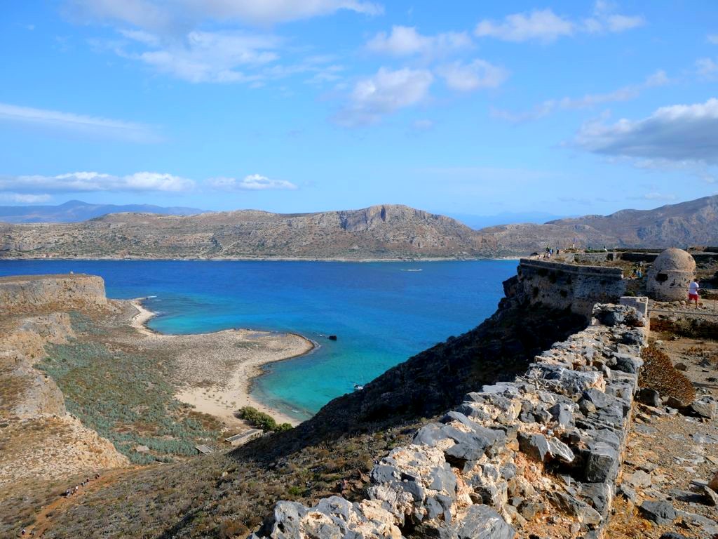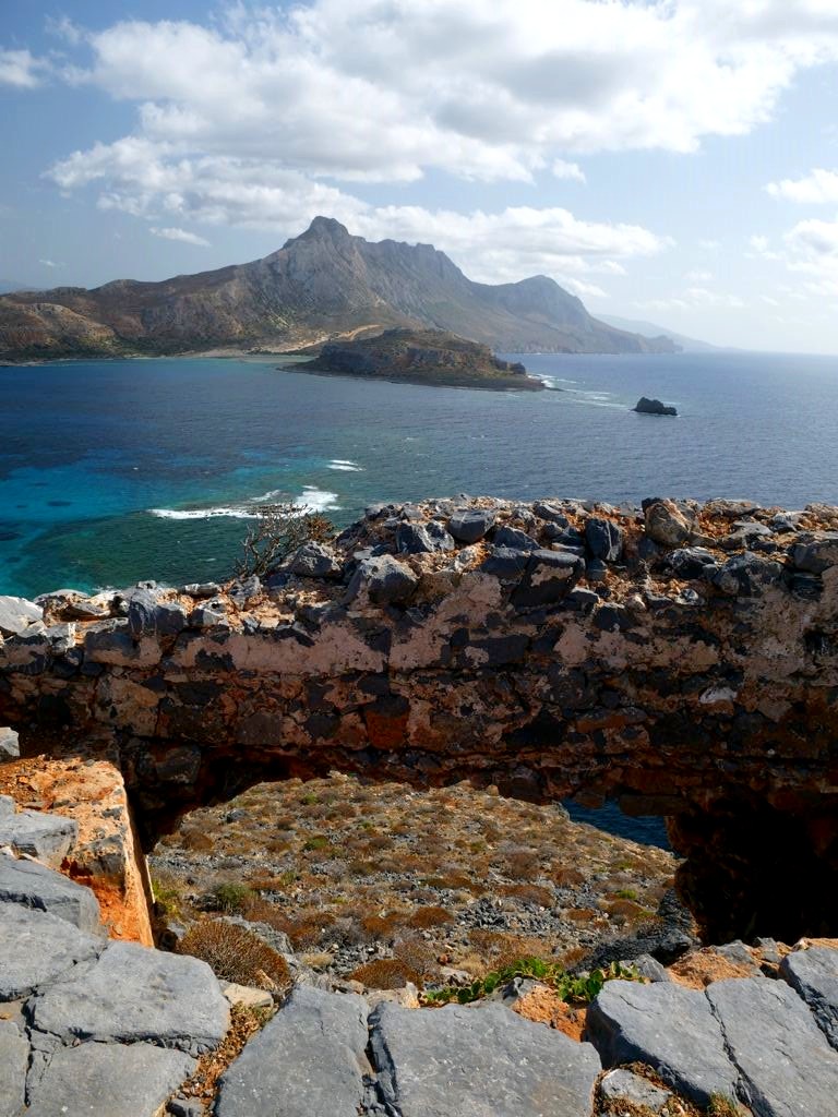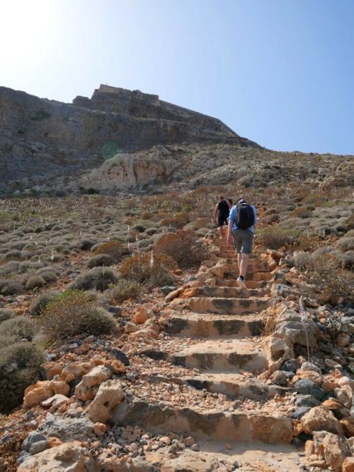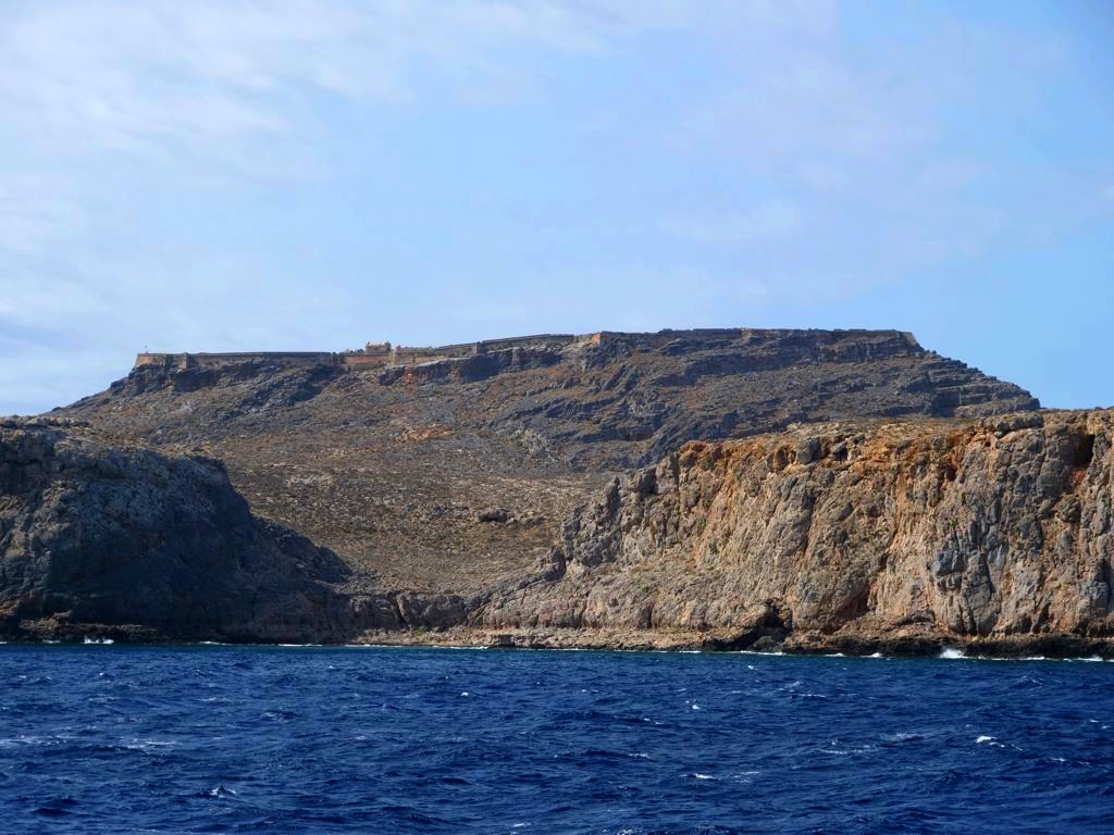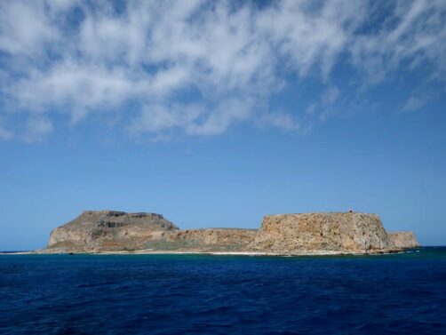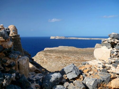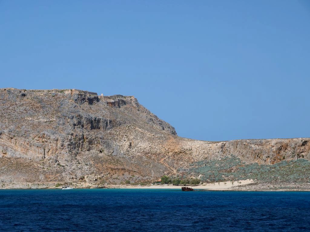 Vous avez le choix de rester à la plage, qui se trouve juste à côté de l’endroit où amarre le bateau est est beaucoup plus calme que celle de Balos, ou de monter au sommet de l’île pour découvrir les ruines de l’ancienne forteresse vénitienne, datant du 16ème siècle, et par la suite occupée par les Ottomans. Evidemment, c’est l’option que nous avons choisie, et les vues panoramiques sur la péninsule, l’île et la baie de Balos en valaient totalement la peine !