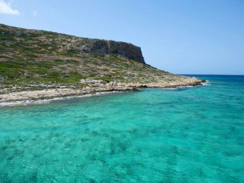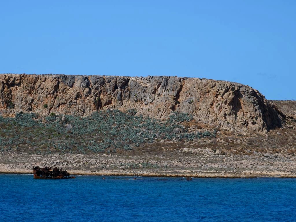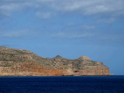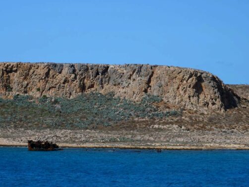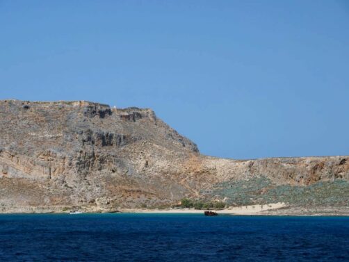 Notre journée commence par une croisière le long de la péninsule de Gramvousa, que l’on contourne pour atteindre la plage de Balos. Pendant environs une heure, on profite de quelques explications par un guide tout en profitant de la vue sur les falaises abruptes et désertiques de la péninsule.