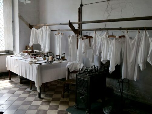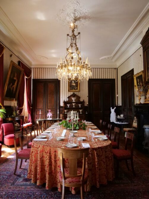 La visite guidée, organisée tous les premiers dimanche du mois de juillet à octobre (12€, plus d’infos sur le site internet du Château de Louvignies) permet de découvrir les intérieurs éclectiques du château, où fut notamment tournée une scène du film Germinal. Après les salles d’apparat et la magnifique salle à manger au rez-de-chaussée, on emprunte les anciens escaliers du personnel pour accéder à la chambre à repasser et au couloir du personnel.