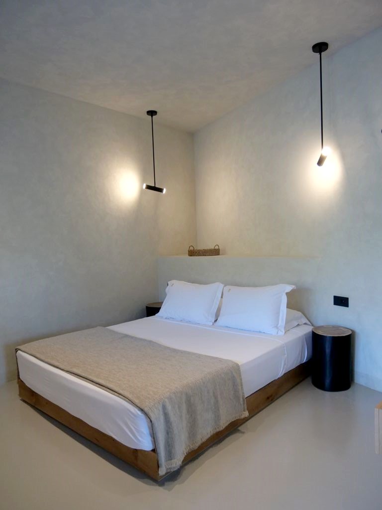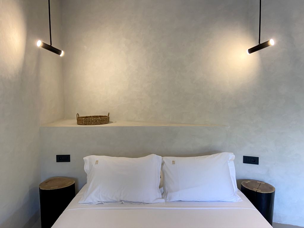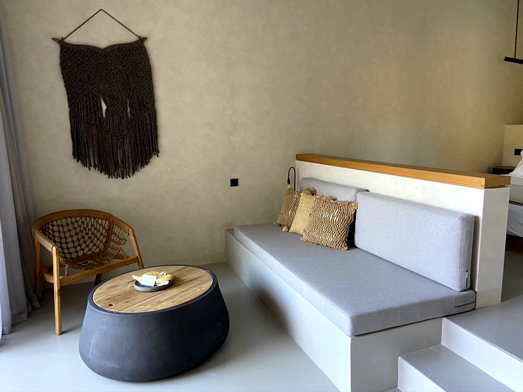 La piscine privée est surplombée par un transat et la terrasse est également équipée de mobilier pour s’installer à l’ombre. Les grandes baies vitrées donnent ensuite sur un petit salon et un espace bureau. On accède par quelques marches à la chambre, avec un lit King size. La salle de bain possède quant à elle un grande douche italienne, et j’ai aussi eu un gros coup de coeur pour leur gamme de produits de toilette.