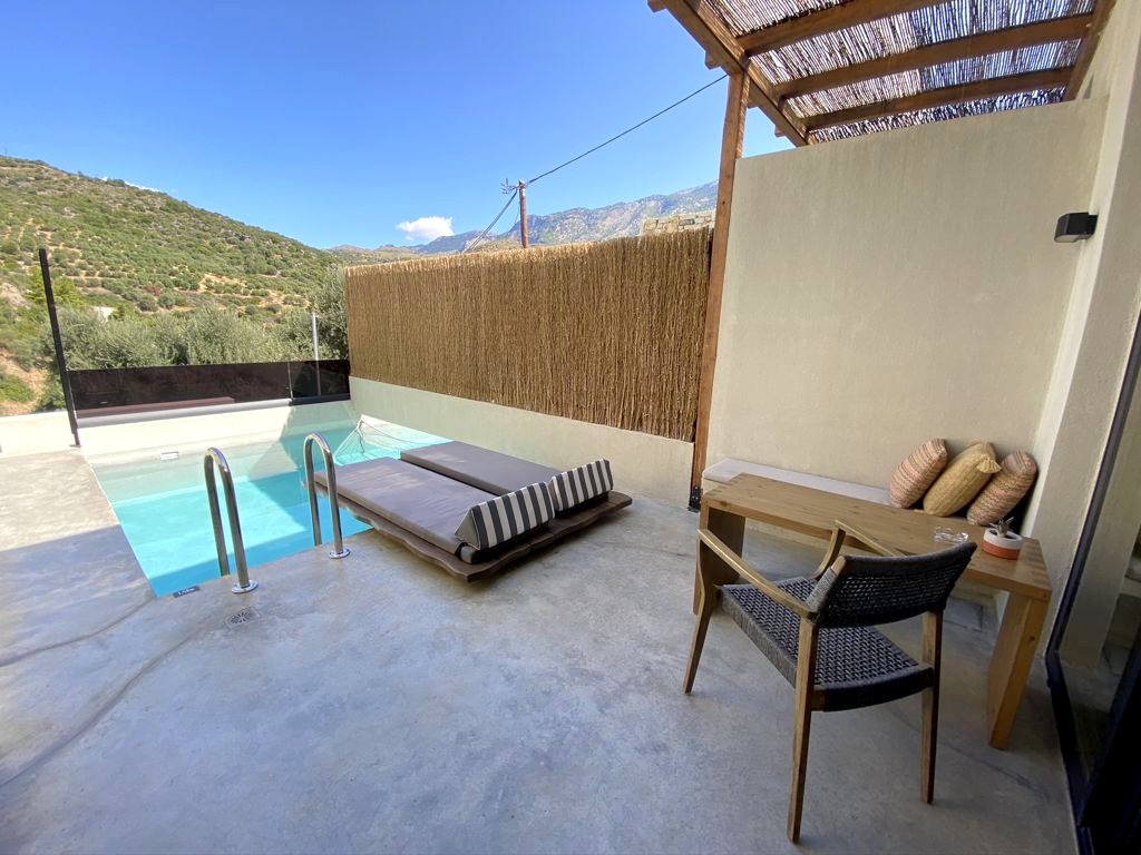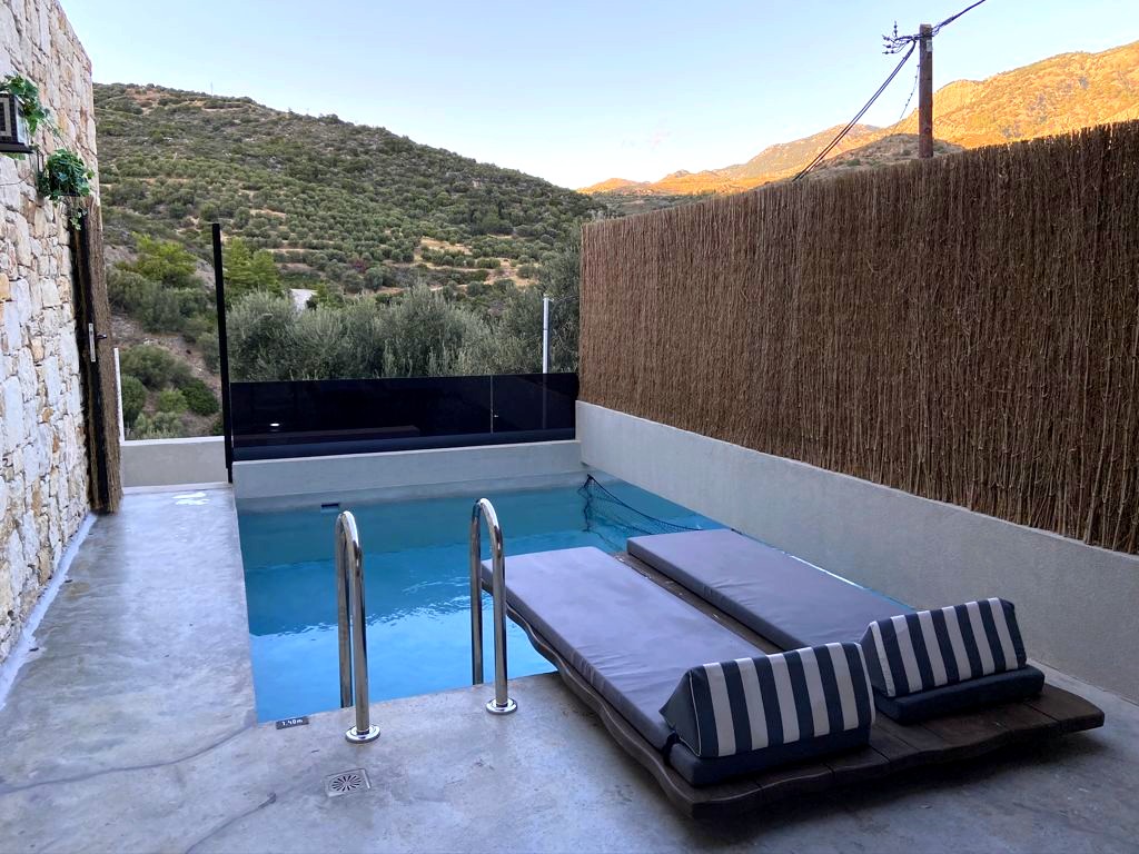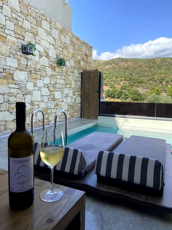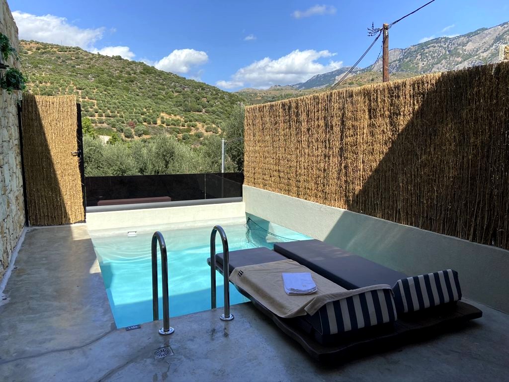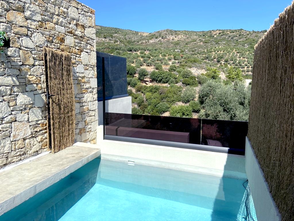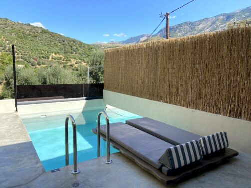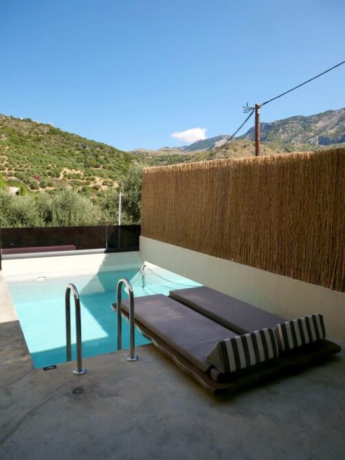 Si vous préférez les jacuzzis aux piscines privées, Monastery Estate possède une deuxième adresse dans le village, le Monastery Estate Guesthouse, qui offre des appartements luxueux tout confort, avec cette même vue sur les montagnes, et avec des jacuzzis extérieurs privatifs. Les piscines n’étant pas chauffées, optez plutôt pour cette option si vous venez en Crète hors saison !
