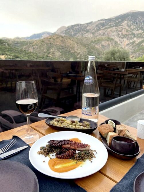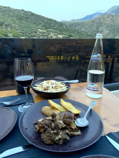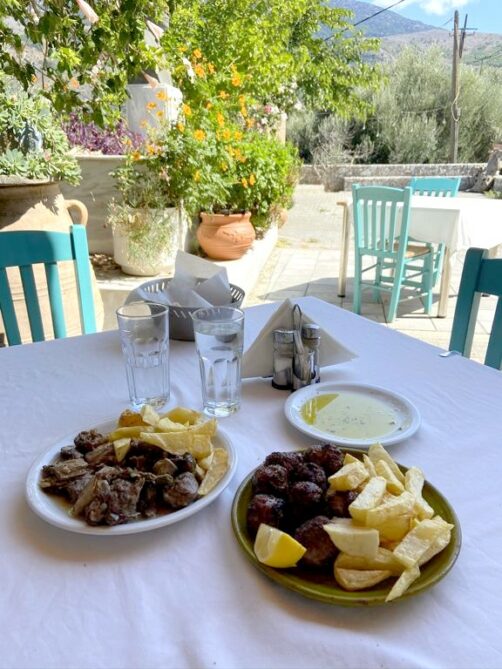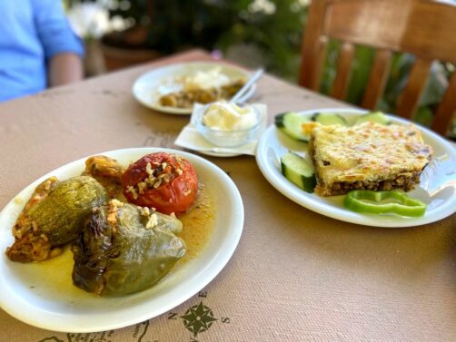 Les restaurants autour de la plage étant par contre pas fameux, je vous recommande plutôt de manger sur le chemin du retour. Le petit village de montagne d’Elos, à 30 minutes de route de la plage, est un bon choix car vous y trouverez de nombreux restaurants traditionnels. Nous avons opté pour la taverne Filoxenia et nous y avons très bien mangé, comme toujours dans ce genre de petit resto en Grèce !