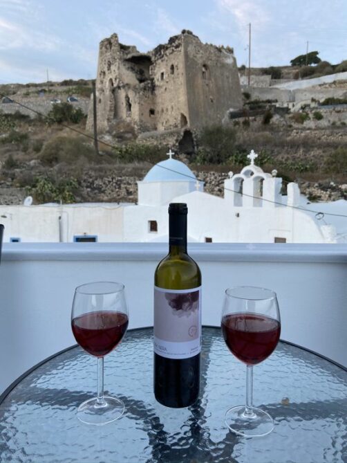 En ce qui nous concerne, nous avons visité le vignoble d’Artemis Karamolegos où nous avons fait une très chouette dégustation sur les hauteurs de Kamari. J’avais choisi ce vignoble, qui ne fait pas partie des plus connus, après avoir acheté par hasard une de leurs bouteilles de vin au magasin, qui m’avait vraiment conquise ! Pas de regret, leur gamme de vin est exceptionnelle pour l’île, et ils ont en plus un excellent restaurant sur place.