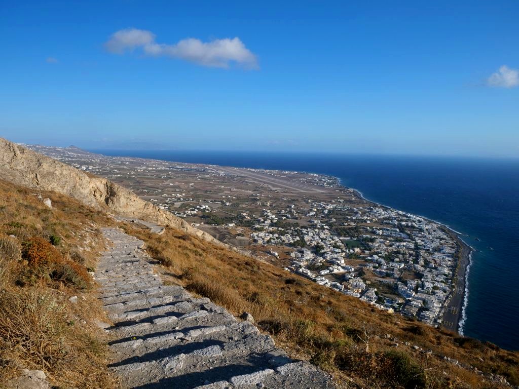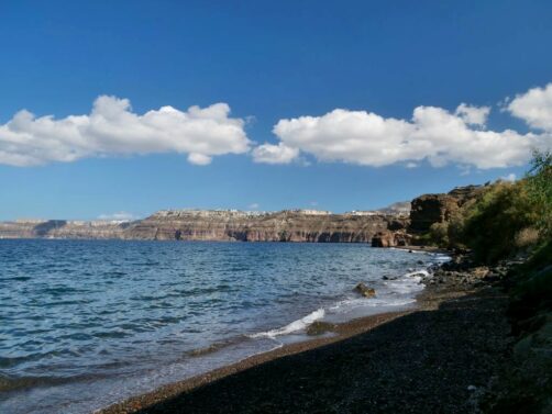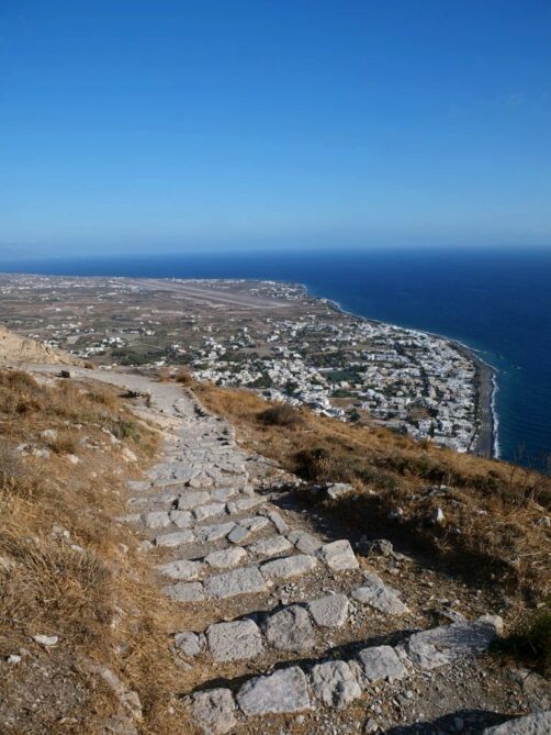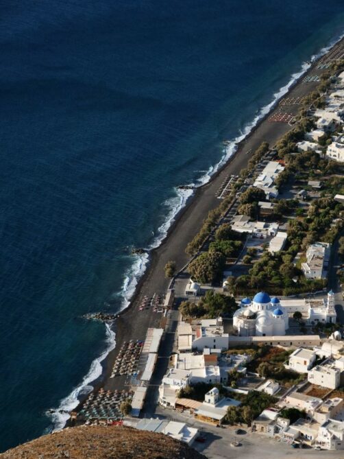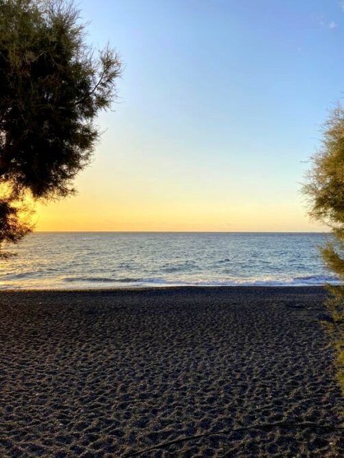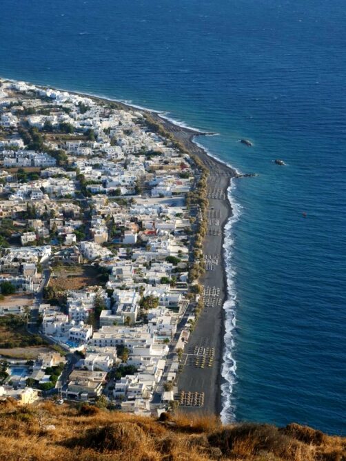 Une longue plage de sable noir populaire en saison, avec plein de petits restos alignés en bord de mer, mais dès la fin septembre (en tout cas en période Covid), il n’y a plus un chat ! Le bonus, c’est qu’on a eu la plage pour nous tous seuls. C’est depuis une extrémité de la plage qu’on accède au site archéologique de Théra (voir plus bas).
