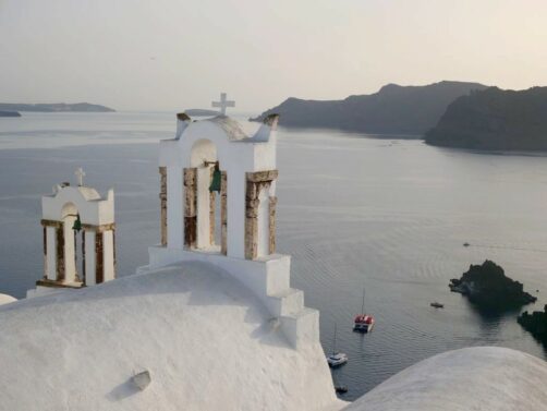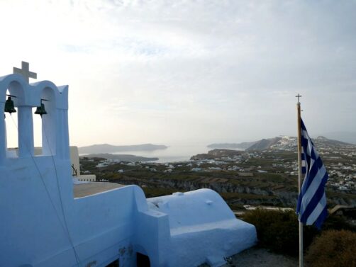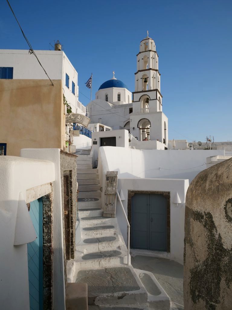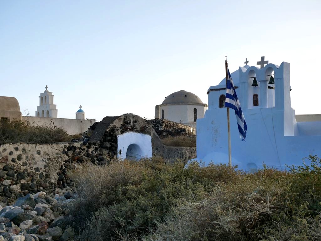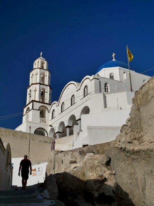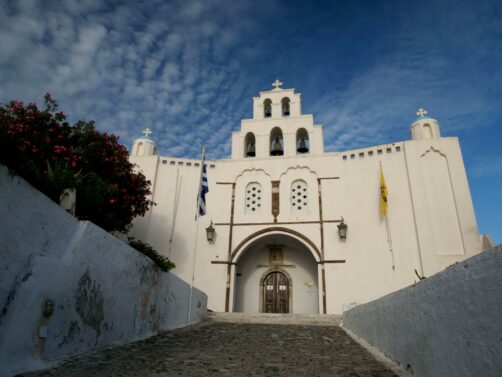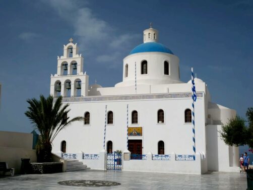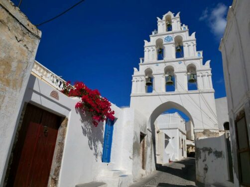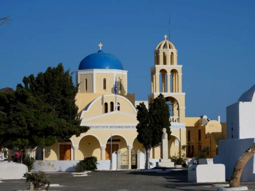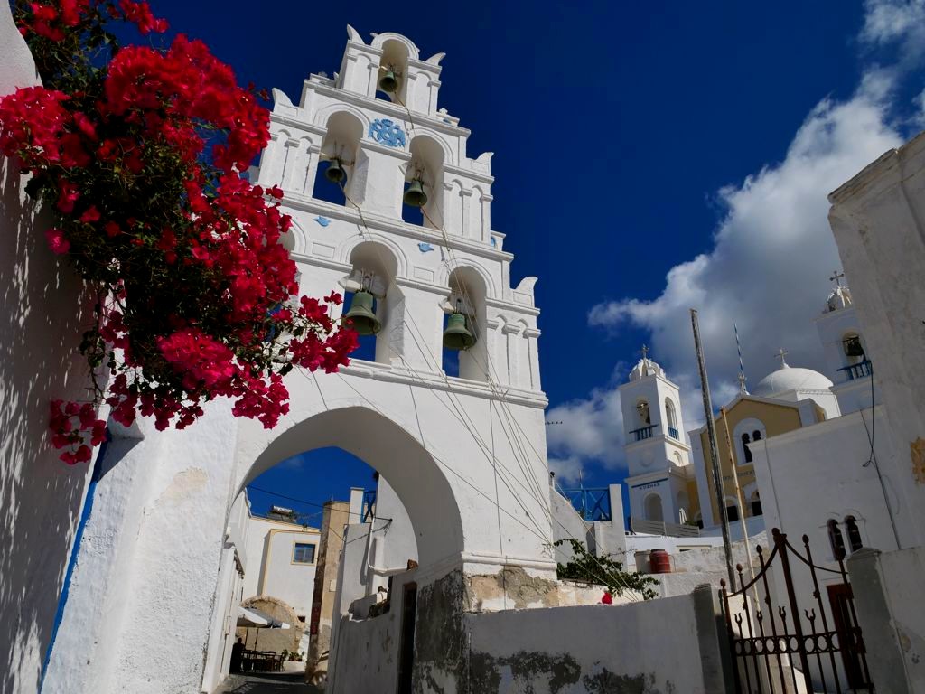 Fira, la capitale de Santorin, n’est pas le village le plus pittoresque mais son musée (voir plus bas) et l’église orthodoxe Saint Theodoros (aussi appelée les Trois Cloches de Fira) valent le coup d’œil.
