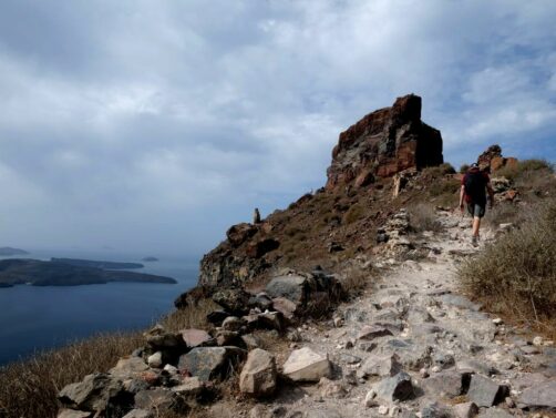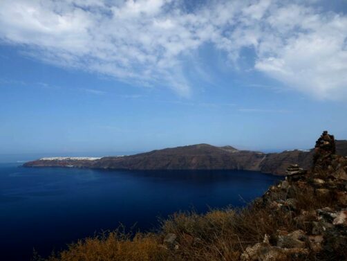 Après avoir passé Firostefani, on arrive à Imerovigli, d’où part une petite randonnée vers le Skaros Rock, un rocher d’où on a de très belles vues sur la caldeira. Cette petite rando peut aussi s’effectuer pendant la randonnée Fira-Oia (on a choisi de la faire séparément car on galérait trop avec la chaleur ce jour-là !).