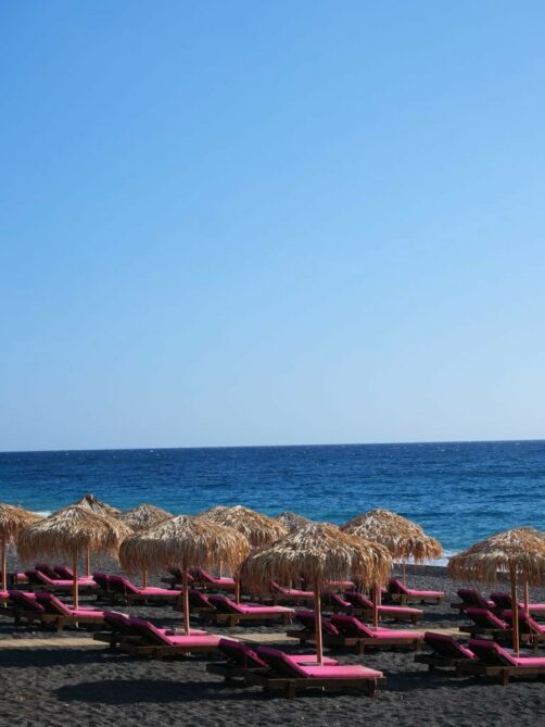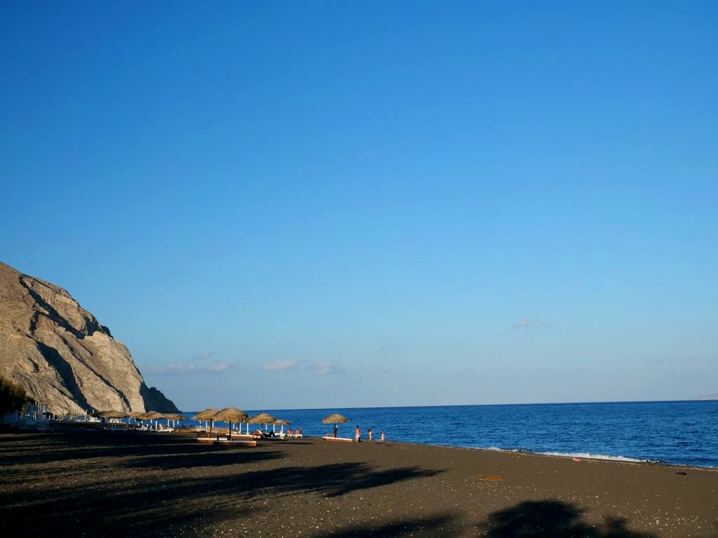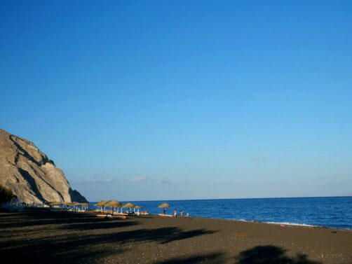 Perissa est une autre plage de sable noir, encore plus longue que celle de Kamari. L’ambiance y est plus populaire.