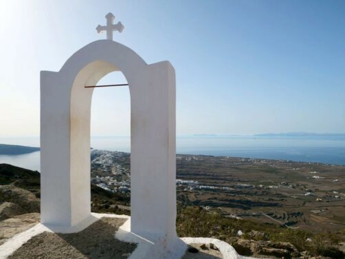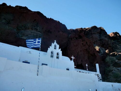 Depuis Pyrgos, poussez également une pointe jusqu’au monastère de Profitis Ilias, situé à l’un des sommets de l’île. La vue y est splendide, mais attention à la montée un peu rude !