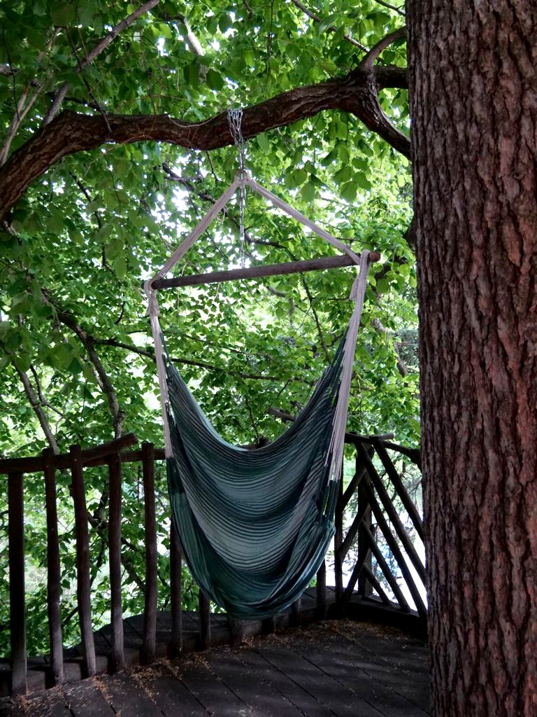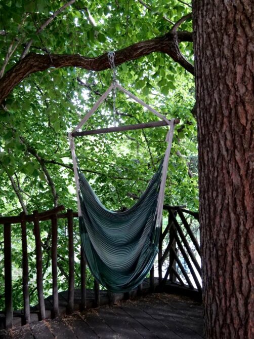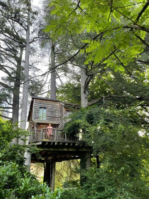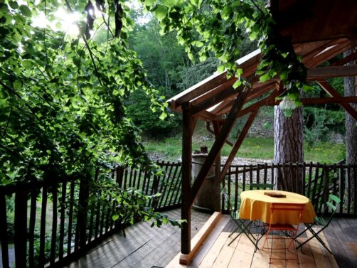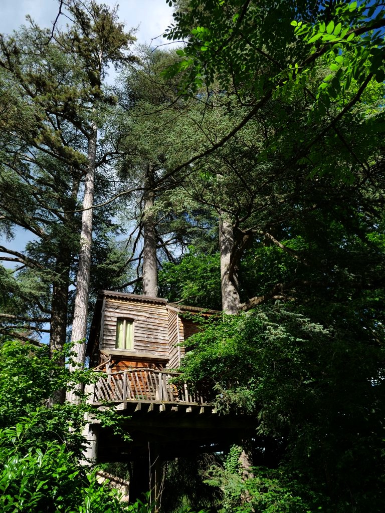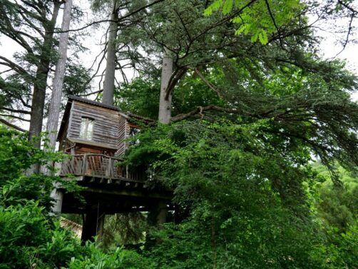 A côté de l’ancien moulinage, se trouve également une cabane perchée dans les arbres : c’est dans celle-ci que nous avons séjourné. Entourée d’arbres centenaires et perchée à 8 mètres de haut, cette grande cabane en bois tout confort est accessible par un escalier facile et peut accueillir jusqu’à 4 personnes.