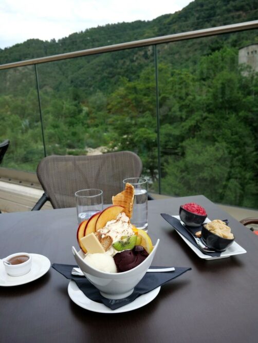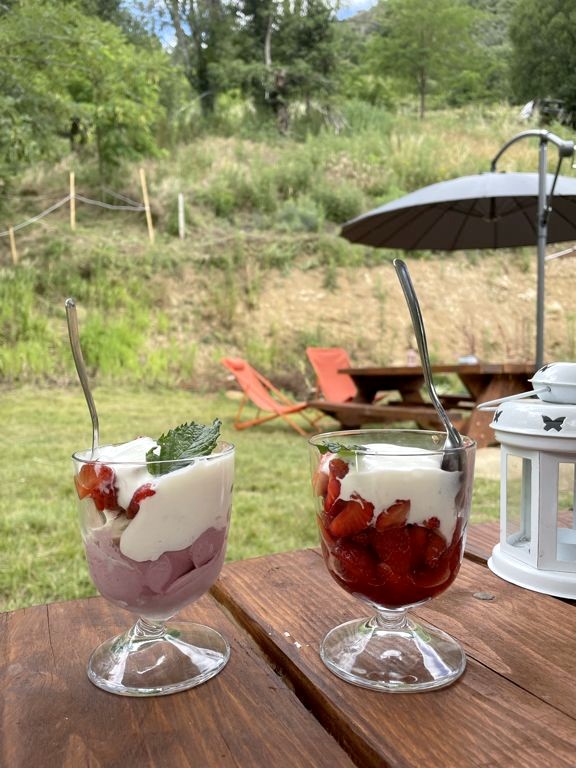 Pour goûter aux saveurs locales, je vous recommande la délicieuse coupe Ardéchoise, avec ses glaces à la châtaigne, à la myrtille et au fromage de chèvre. Un véritable régal à déguster sur leur nouvelle terrasse avec vue sur la rivière, pour une expérience 100% ardéchoise.