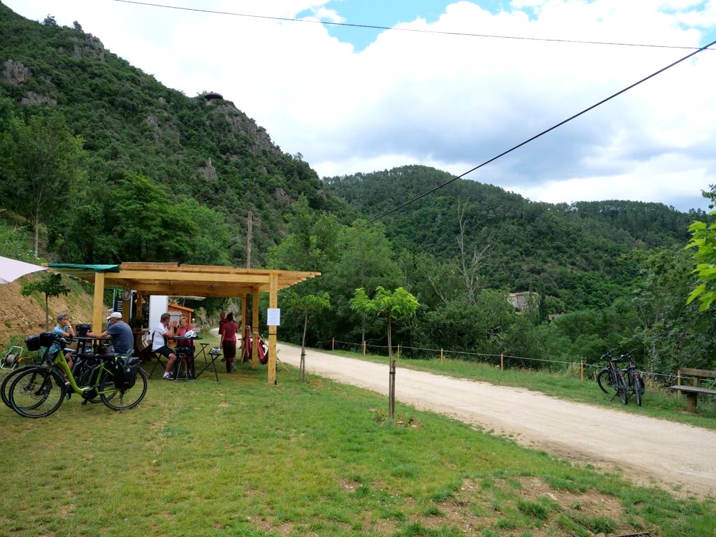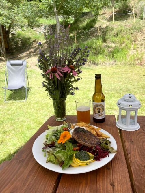 Ce passionné récolte tout à la main le matin même, et sert aux cyclotouristes de jolies assiettes pleines de saveurs. A partir de l’année prochaine, il aura même ses propres bêtes, pour des assiettes 100% maison même pour les carnivores ! Ajoutez à cela de bonnes bières locales (la bière à la châtaigne ou au miel, immanquable aussi en Ardèche), et vous obtenez la pause parfaite !