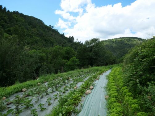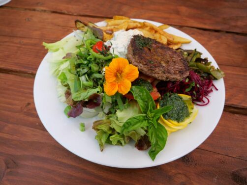 A quelques kilomètres d’Ollières-sur-Eyrieux, au niveau de l’Aquarock, nous avons mangé à L’Assiette du Jardin, un tout nouveau foodtruck installé par Thomas juste à côté de ses jardins en terrasse.