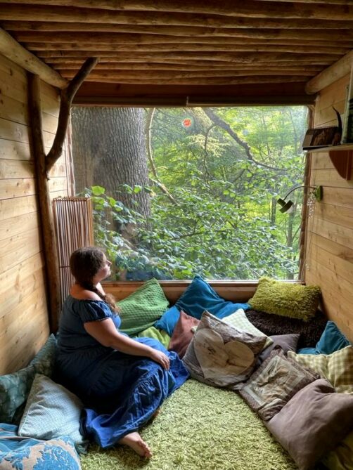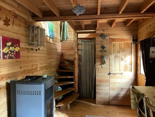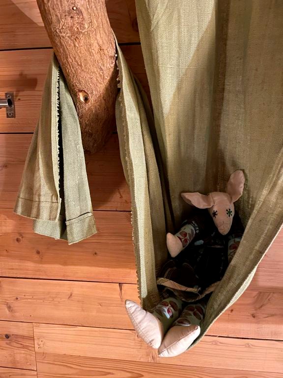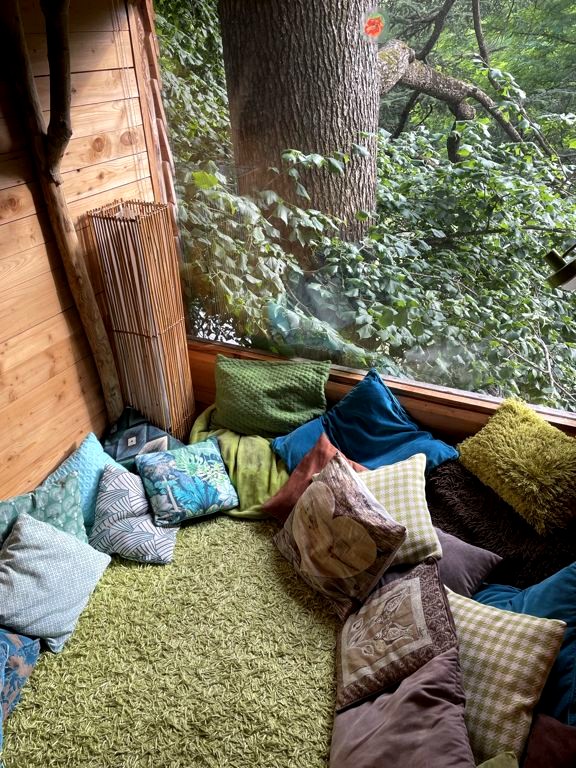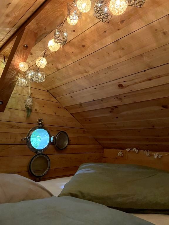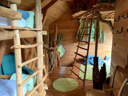 Vous y trouverez à l’étage du bas une grande terrasse avec table, transats et hamacs, et à l’intérieur une cuisine équipée, un coin repas, et des toilettes sèches. A l’étage se trouve un espace très cosy recouvert de coussins pour se poser devant la grande baie vitrée et observer la nature. Au même niveau se trouvent deux lits superposés, et en mezzanine, accessible par une échelle, vous trouverez un grand lit double.