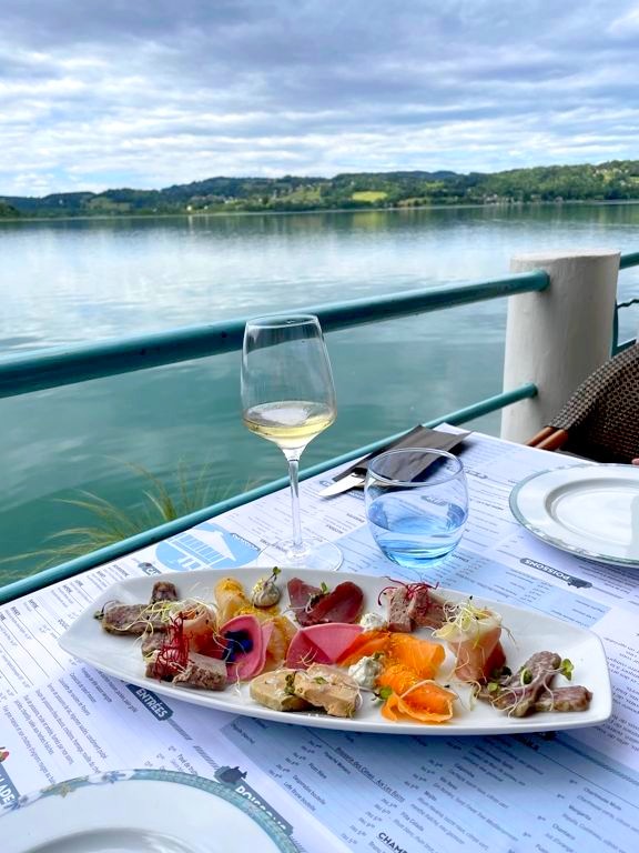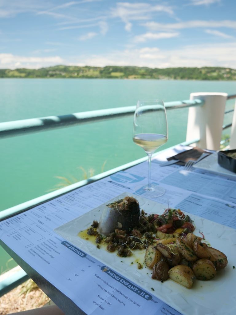 Après cette magnifique balade, nous avons repris la voiture (mais on peut aussi y aller en vélo) jusqu’au restaurant Les Belles Rives. Nous avons mangé un délicieux repas (accompagnés d’une belle sélection de vins de la région) au bord du lac dans ce sympathique restaurant repris depuis peu par une équipe jeune, passionnée et dynamique.