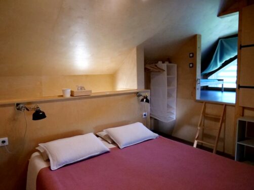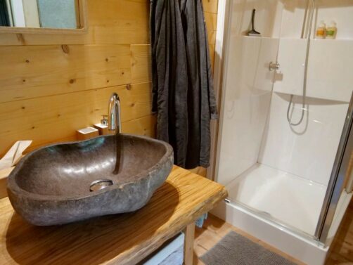 Les cabanes sont adaptées aux familles : la nôtre (et c’était la plus petite !) possédait à l’étage une chambre parentale et une chambre avec deux lits enfant (façon cabane dans les arbres, vraiment sympa). Au rez-de-chaussée de la cabane, nous avions un grand espace avec coin salon, salle à manger, cuisine équipée et salle de bain avec douche.