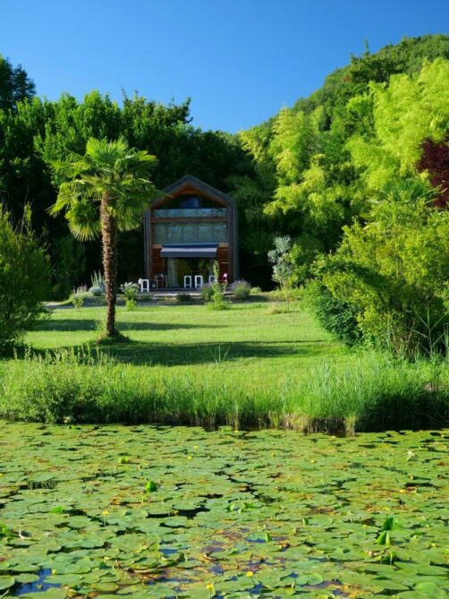 Les propriétaires Elodie et Ronald ont voulu avoir une démarche la plus durable possible, qui se traduit notamment par la présence d’une piscine naturelle et d’un système de phyto-épuration pour le traitement des eaux usées par les plantes.