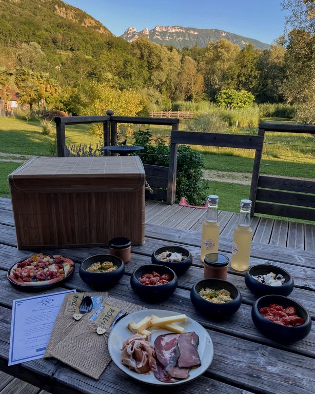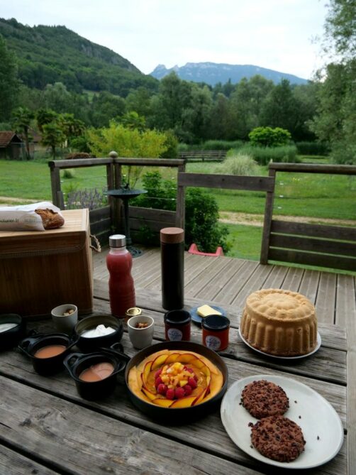 Le cuisinier, Mathieu, a travaillé dans plusieurs restaurants étoilés (Les Morainières à Jongieux, le Clos des Sens à Annecy…) et propose de jolies préparations élaborées à partir de produits locaux et de saison, accompagnées de boissons, et livrées dans de la belle vaisselle (il vient rechercher le panier et la vaisselle par la suite), le tout pour seulement 25€ par personne. Il livre dans toute la région de Yenne et sans mentir, ce fut le meilleur panier de petit-déjeuner que je n’ai jamais mangé, donc n’hésitez pas à passer commande si vous séjournez dans son périmètre de livraison !