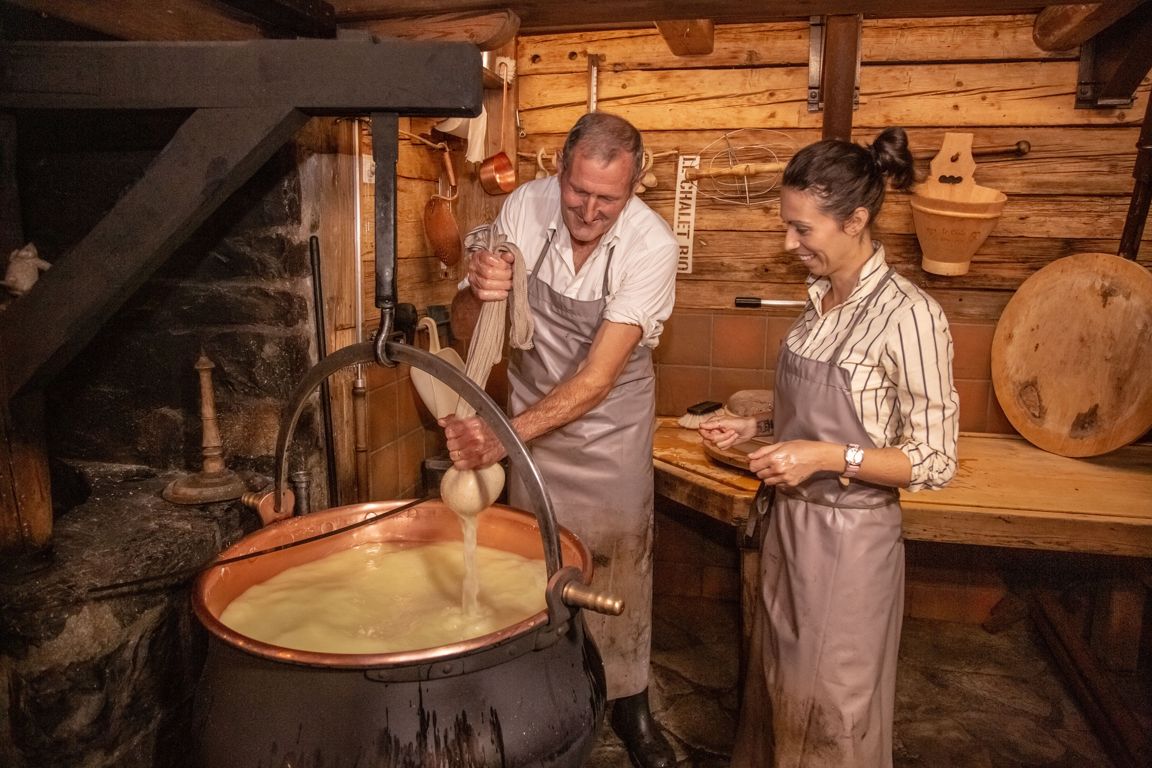 Parmi la centaine de produits locaux labellisés Produits Authentiques du pays-d’Enhaut, le plus connu est probablement L’Etivaz AOP, un fromage d’alpage au goût unique, produit uniquement entre 1000 et 2000 mètres d’altitude ! Sa fabrication est tout aussi unique, puisqu’il est transformé dans des grands chaudrons en cuivre posés sur un feu de bois.