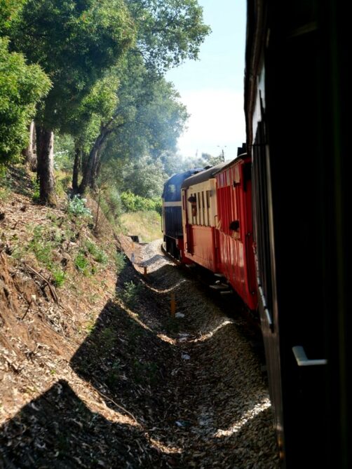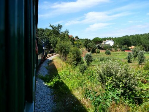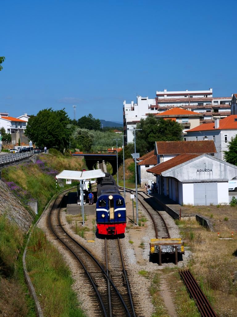 Les voitures du train datent du début du 20ème siècle et sont tractées par une locomotive diesel historique. Ce trajet, relancé récemment, parcourt toujours la ligne de la Vallée du Vouga inaugurée en 1908. A l’origine, la ligne comptait entre Espinho et Viseu pas moins de 20 tunnels allant jusqu’à 74 mètres de long. On en passe aujourd’hui une petite partie entre Aveiro et Macinhata.