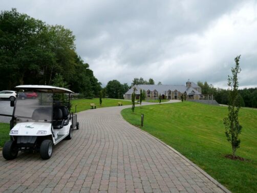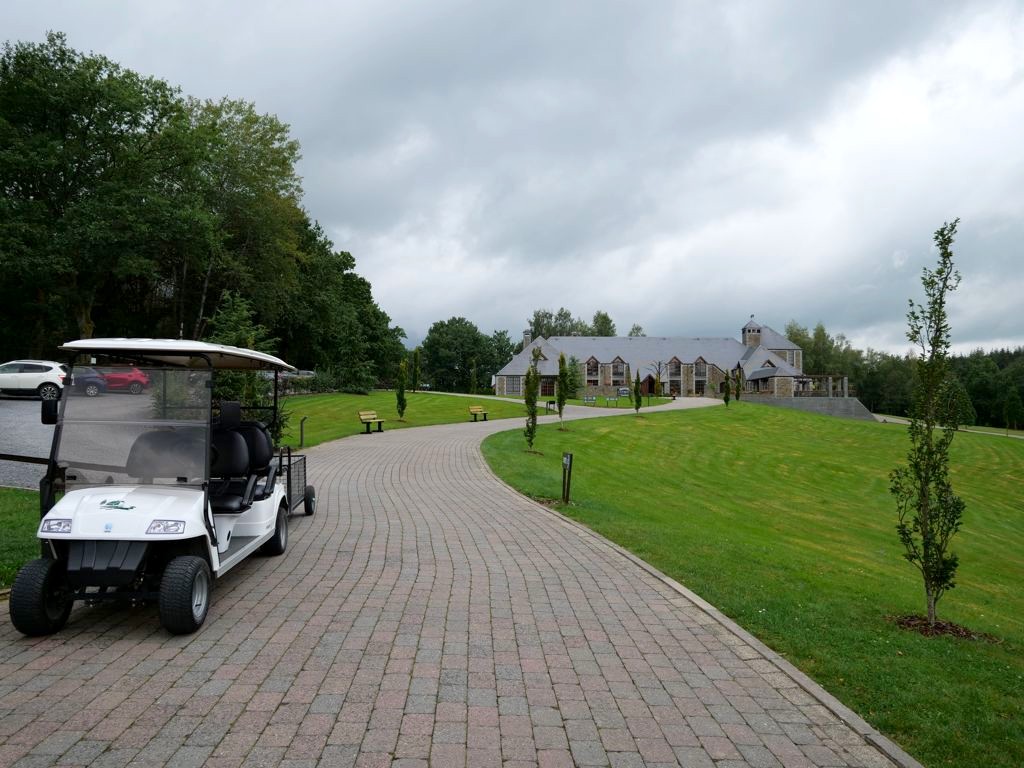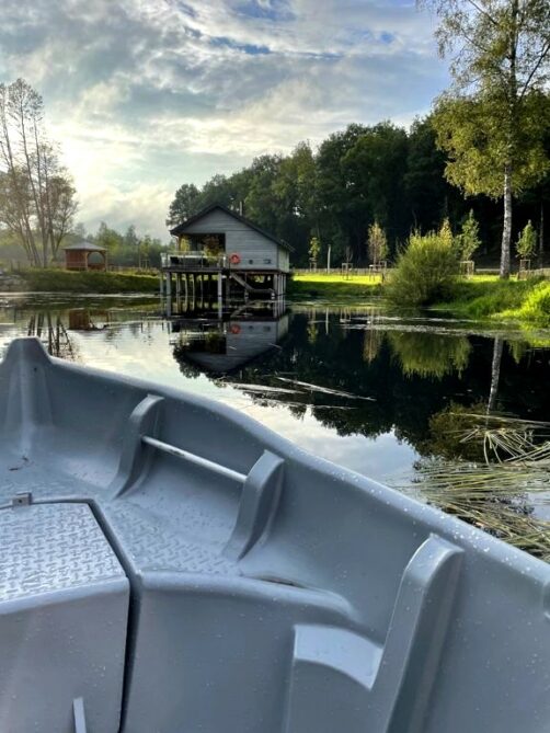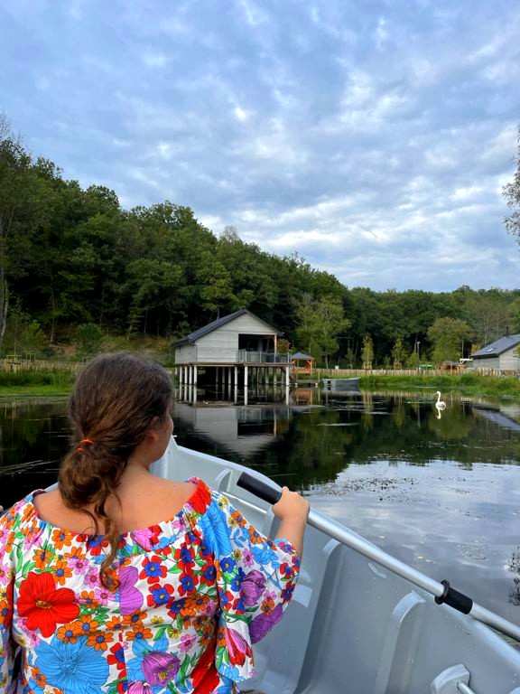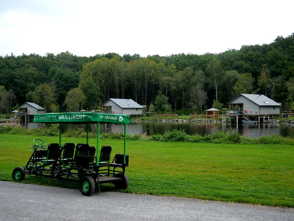 Afin de garder toute sa tranquillité, la particularité du domaine est que les voitures y sont interdites : celles-ci doivent rester dans le grand parking situé à l’entrée des lieux. C’est donc une petite voiturette de golf électrique (qu’on peut appeler au besoin) qui nous emmène jusqu’à notre lodge avec nos valises. Une fois sur place, nous aurons également accès à deux autres moyens de transport on ne peut plus originaux dont dispose chaque cabane pour nous déplacer sur le domaine : un cuistax et une barque !