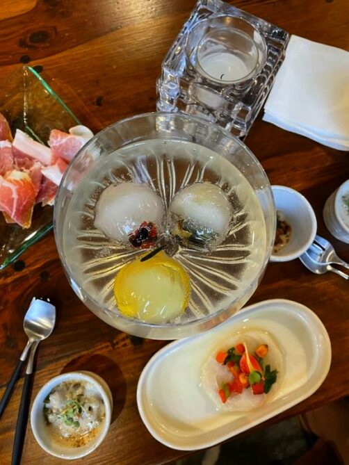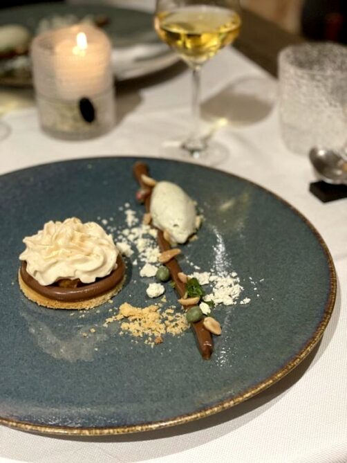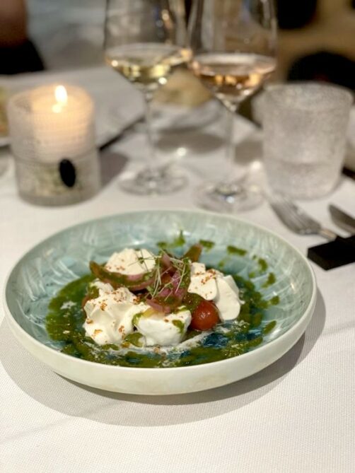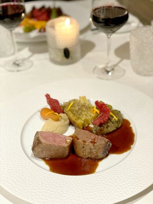 J’ai en particulier adoré l’entrée à base de tomates marinées et de mozzarella belge de Neufchâteau (produite non loin de là) ainsi que les ris de veau façon carbonara, accompagnés d’une sauce au guanciale. En plat principal, le veau local était tendre à souhait, et accompagné d’une sauce montée à la moelle et d’un gourmand gratin à la truffe d’été.