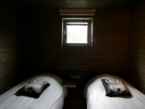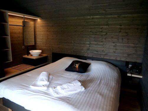 Les 14 lodges en bois du domaine peuvent accueillir entre 2 et 6 personnes. Nous avons séjourné dans une des cabanes pour 6 personnes, comprenant trois chambres (2 chambres avec lits jumeaux et une chambre avec lit double). Chaque chambre possède un évier en plus de la salle de bain avec douche commune aux trois chambres.