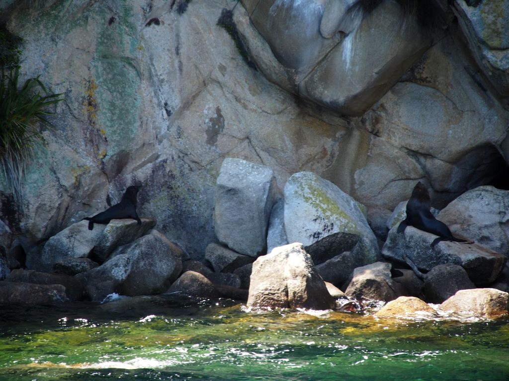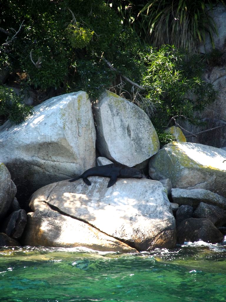 Nous avons passé une journée complète dans le parc national d’Abel Tasman. Après avoir longuement hésité entre les différentes possibilités proposées par les Abel Tasman Sea Shuttles, nous avons opté pour la formule consistant à se faire déposer le matin en bateau à Apple Tree Bay, après plusieurs « escales » à des plages sur la route pour déposer des personnes, et un passage par Tonga Island pour voir les otaries à fourrure, puis à randonner (2-3 heures de marche) jusqu’à Anchorage, l’un des plus beaux endroits du parc, d’où on reprend un bateau jusqu’au point de départ (Totaranui).