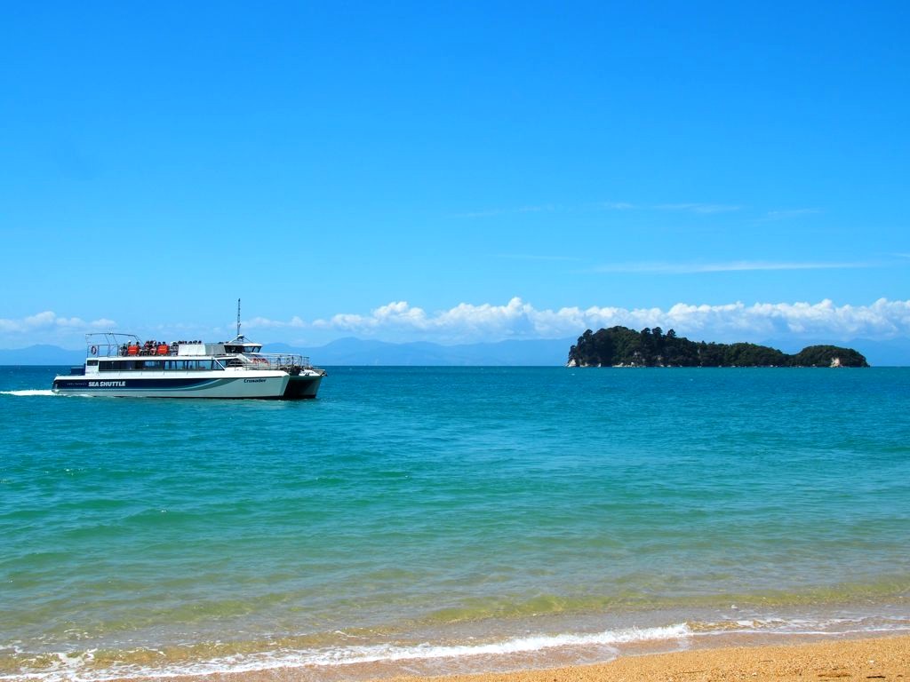 - les bateaux-navettes d’Abel Tasman Sea Shuttles : ce sont des bateaux assez spacieux qu’on peut emprunter soit juste pour un transfert vers un point dans le parc, avec un retour depuis un autre point à la fin de votre randonnée (formules « croisière-rando », comme celle que nous avons fait), soit pour des croisières scéniques. L’avantage de cette compagnie est que c’est la compagnie qui offre le plus d’options et donc de flexibilité. En plus, même en ne prenant qu’un forfait qui inclut juste les transferts, on profite quand même des commentaires touristiques sur le bateau, qui se rapprochera de la colonie d’otaries à fourrure de Tonga Island au passage. On a choisi cette option et on n’a pas regretté. C’est un bon compromis entre flexibilité, autonomie et confort. Si vous partez du sud, ils ont tout de même des options qui vous permettront d’être un peu tranquille.
