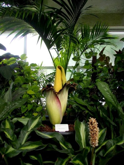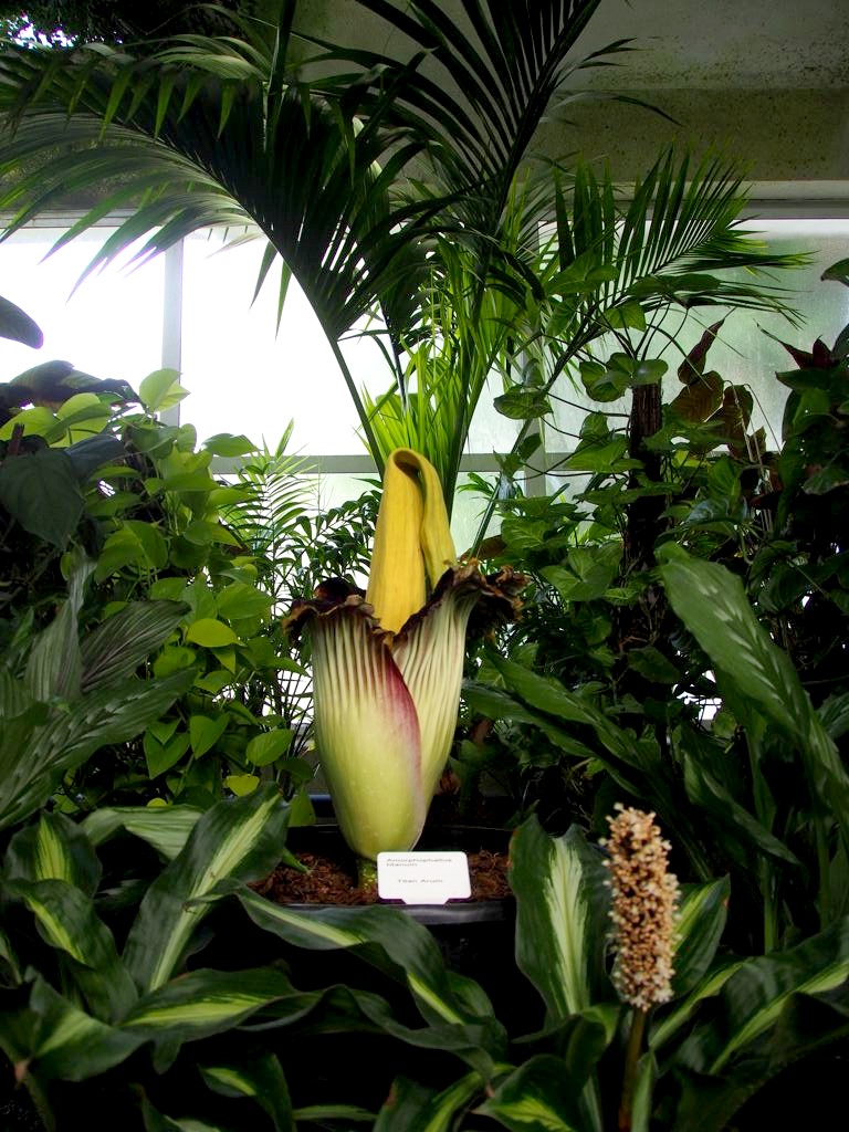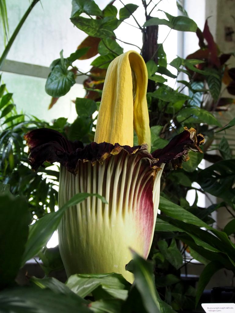 Intrigués, nous nous rendons compte que nous sommes tombés par hasard sur la floraison d’une « corpse flower », ces fameuses fleurs gigantesques qui ne fleurit qu’une fois tous les 10 ans et qui doit son nom au fait qu’elle sent… le cadavre en décomposition ! Nous n’en avions encore jamais vu (même s’il y en a une aussi en Belgique… oups), nous avons donc profité de l’occasion et fait la file pour la voir. Une expérience insolite mais qui valait quand même le coup !